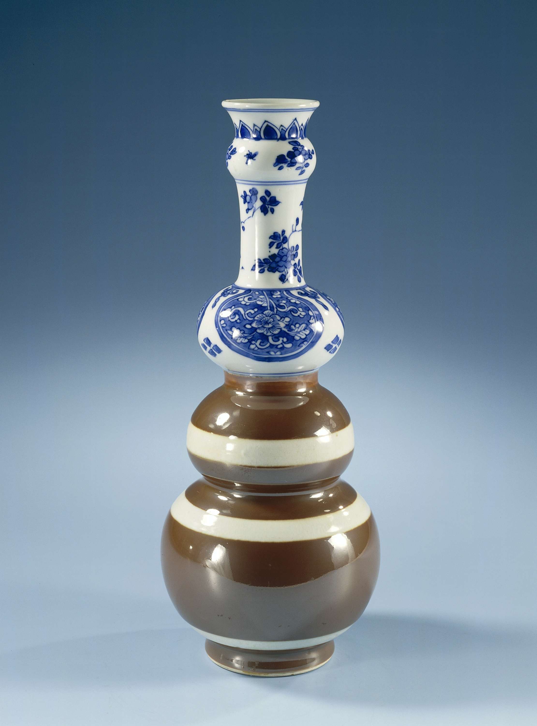Flesvormige vaas (knobbelfles) van porselein bestaande uit drie bollen, lange nek met verdikking en spreidende rand, bedekt met een café-au-lait glazuur en beschilderd in onderglazuur blauw. De onderste twee bollen zijn bedekt met een bruin glazuur afgewisseld met drie crèmekleurige banden; op de bovenste bol in blauw drie verbonden cartouches met bloemranken in reserve; de nek met bloemtakken, vlinders en insecten; de rand met een band met bladmotieven. Twee chips in de rand. Op de onderzijde een oud label met: Vrienden der Aziatische Kunst. Monochroom bruin met blauw-wit. (Nederlands)