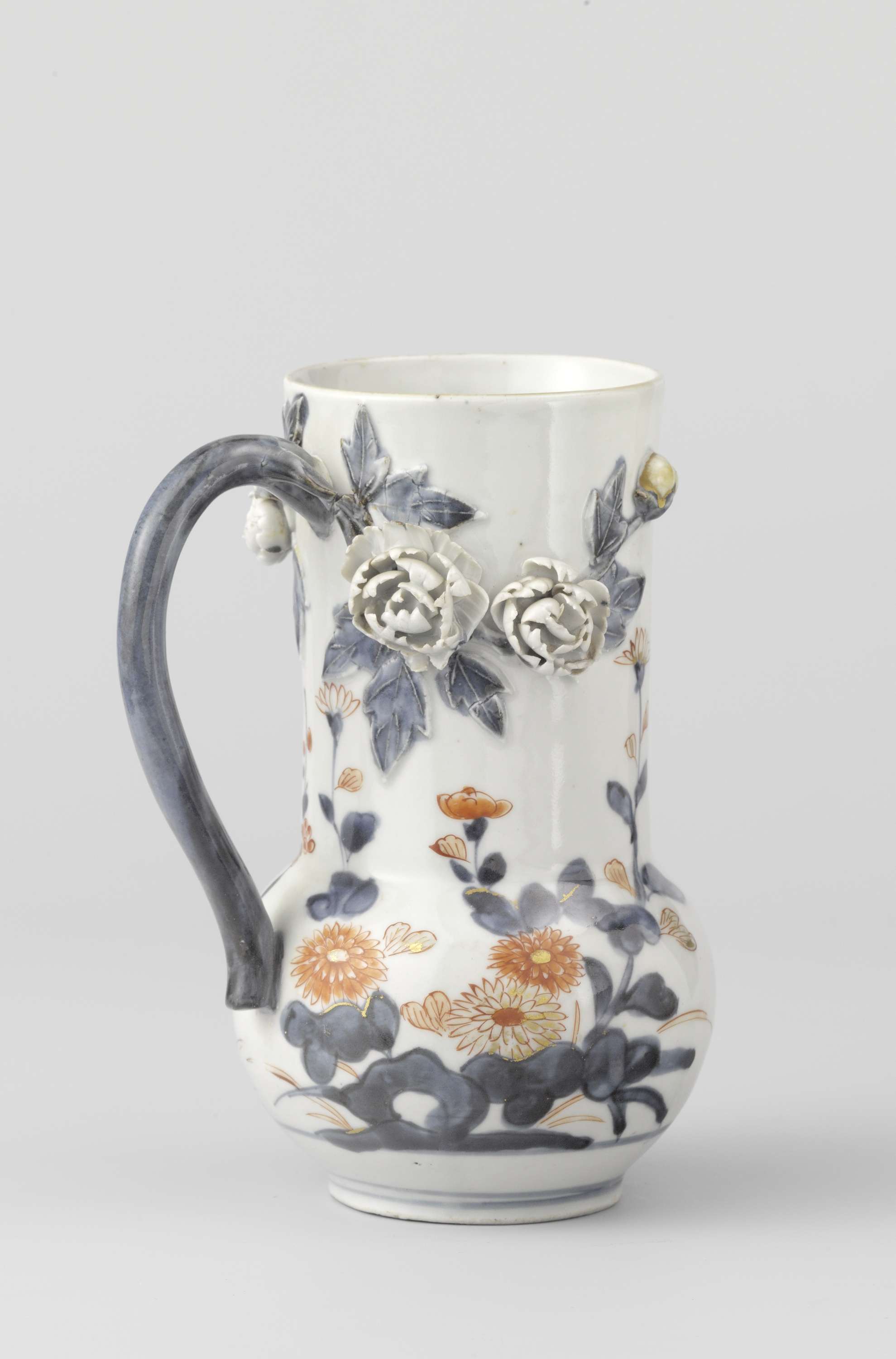 Bierpul van porselein met gedrukt bolvormig lichaam en een wijde, lange nek, beschilderd in onderglazuur blauw en op het glazuur rood en goud. Op de buitenwand aan de onderzijde een geschilderde prunusboom, chrysant, lotus en grassen. Het S-vormige oor is gemodelleerd in de vorm van een pioentak, waarvan twee twijgen met bloemen in reliëf doorlopen op de nek. De nek met de letter 'B' in een medaillon. Europese vorm in Imari. (Nederlands)