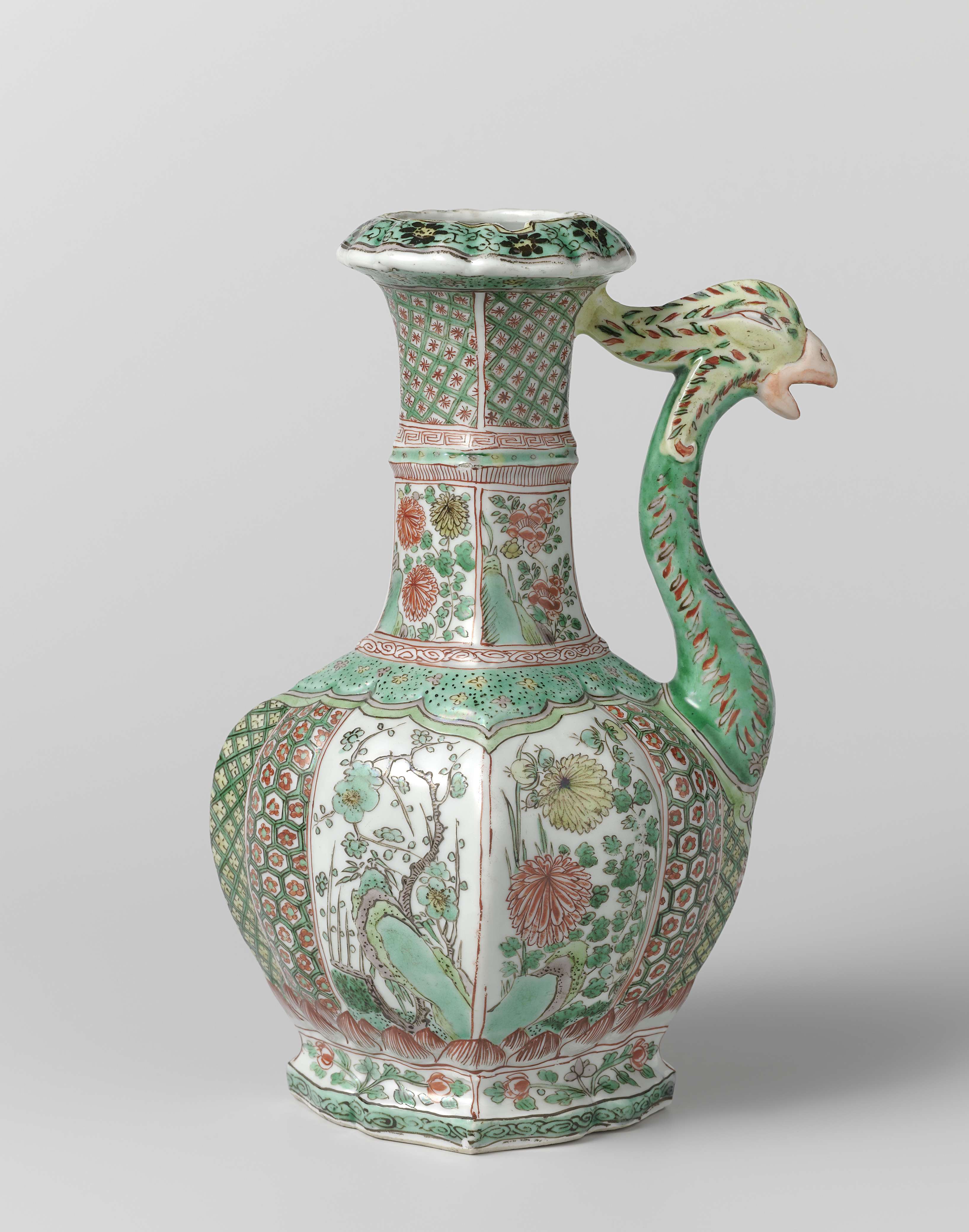Wijnkan, famille verte, gebombeerd model met vogelkop als tuit, buik heeft vier grote en zes kleinere vakken. (Nederlands)