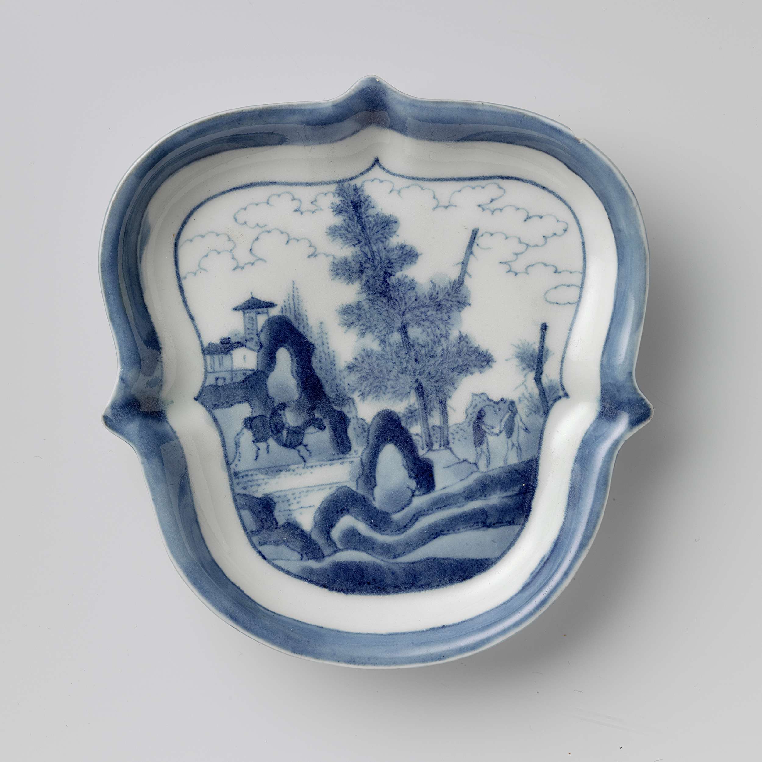 Schaal van porselein met accoladevormige wand en rand, beschilderd in onderglazuur blauw. Op het plat een landschap met daarin een ruiter en twee lopende mensen tussen rotsen en bomen. Op de achtergrond twee paviljoens en wolken. De binnenrand is met een blauwe band. Gemerkt op de onderzijde met het zes-karaktermerk van keizer Chenghua. Vier proenen op de onderzijde. Arita, blauw-wit. (Nederlands)