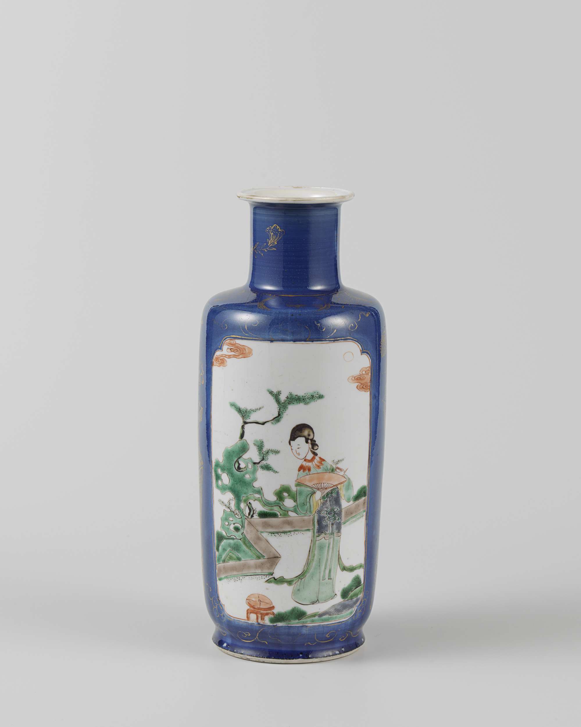 Rolwagen vaas van porselein met platte schouder, rechte hals en vlakke rand, beschilderd in onderglazuur blauw en op het glazuur blauw, rood, groen, geel, aubergine, zwart en goud. De wand is bedekt met bleu poudré (poederblauw) met hierin uitgespaard twee rechthoekige velden met ingeknepen hoeken, de een gevuld met een vrouw met een twijgje en waaier naast een kruk op een terras met rotsen en planten, de ander met een vrouw met een twijgje naast een tafel in een omheinde tuin met rotsen, planten en een boom; om de vakken een decoratie in goud, tussen de vakken een bloemvaas, om de voet krulwerk, op de schouder een swastika patroon afgewisseld met vakken gevuld met antiquiteiten, op de hals bloemtakken. Bleu poudré met famille verte. (Nederlands)