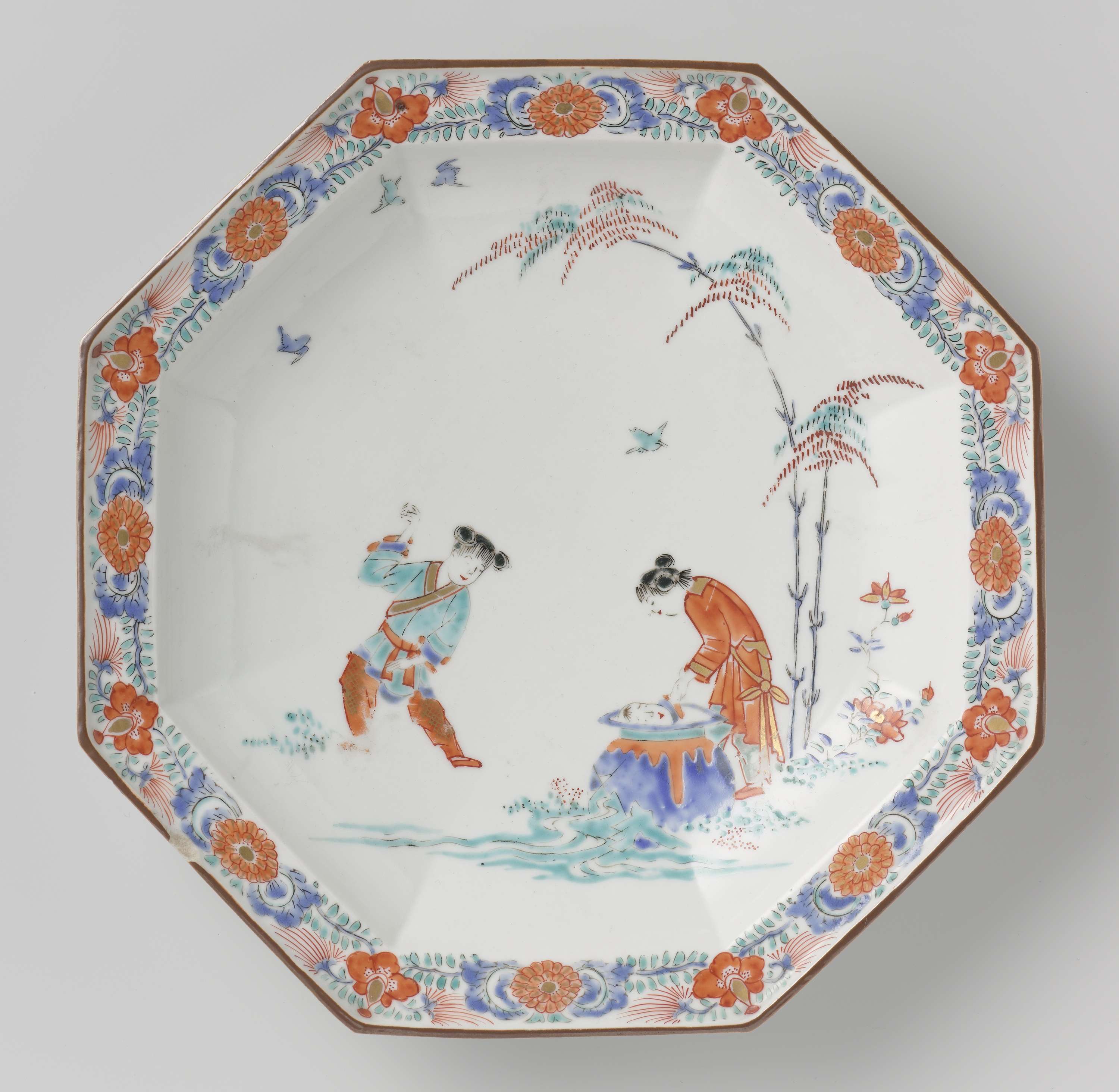 Achthoekig bord van porselein, beschilderd op het glazuur in blauw, rood, groen, zwart en goud. Op het plat een voorstelling van Shiba Onko (Sima Guang) naast de waterpot waar een kind in is gevallen. Een derde persoon staat aan de andere zijde van de pot. Op de rand een band met bloemranken. Bruine rand. Arita, Kakiemon. (Nederlands)