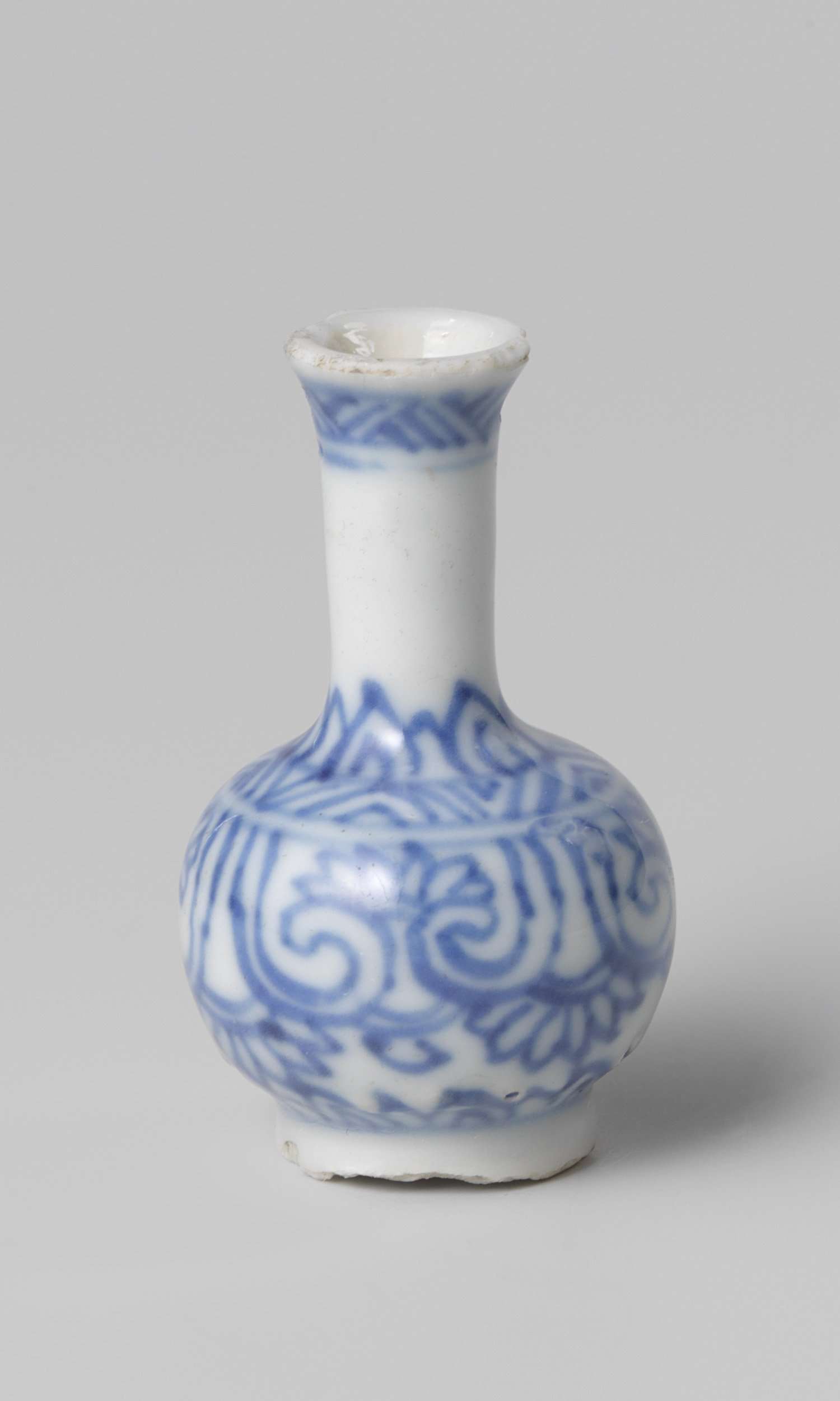 Miniatuur flesvormige vaas van porselein met een bolvormig lichaam en lange, smalle nek met iets spreidende mond, beschilderd in onderglazuur blauw. Op de buik lotusranken. De schouder met een band met een zigzag-patroon en bladmotieven. De rand met een zigag-patroon. Blauw-wit. (Nederlands)