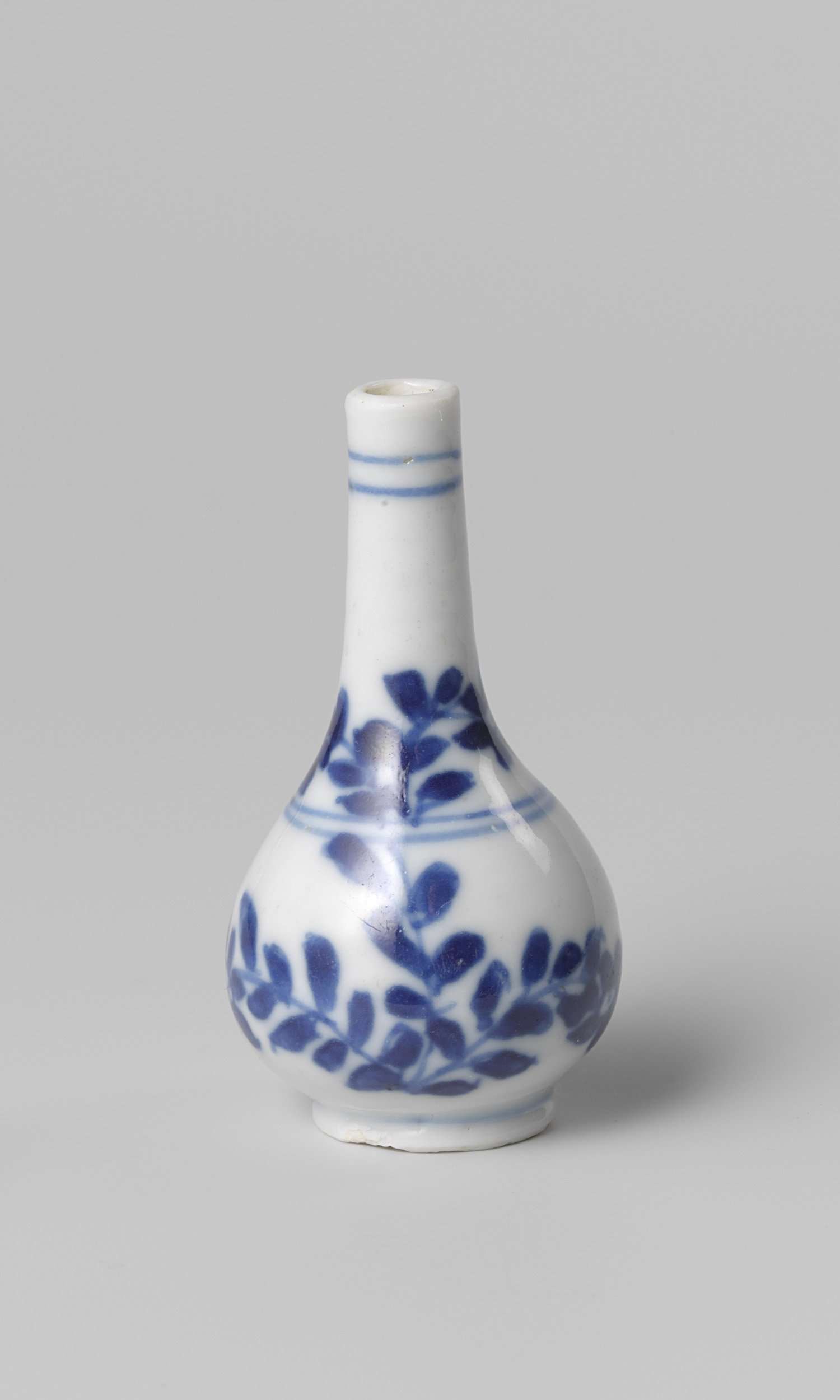 Miniatuur flesvormige vaas van porselein met een peervormig lichaam, beschilderd in onderglazuur blauw. Op de wand en schouder een bloeiende plant. De andere zijde met een strik. Blauw-wit. (Nederlands)
