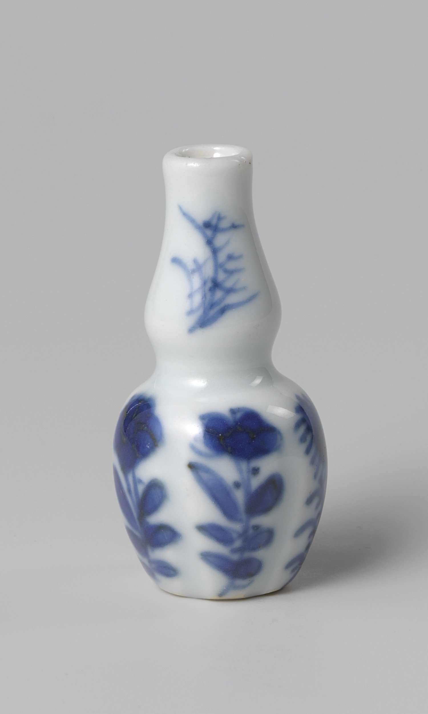 Miniatuur zeslobbig, flesvormige vaas van porselein, beschilderd in onderglazuur blauw. Op de wand zesmaal een bloeiende plant. De nek met twijgjes. Blauw-wit. (Nederlands)