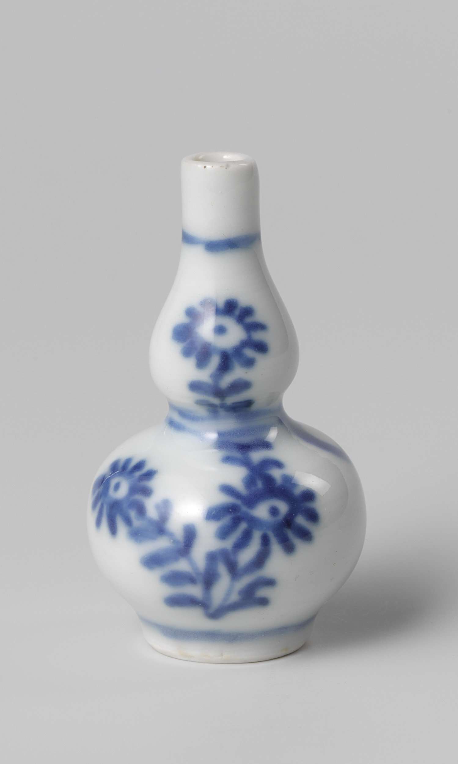 Miniatuur kalebasvormige vaas van porselein, beschilderd in onderglazuur blauw. Op de wand bloeiende planten (aster) en een strik. Blauw-wit. (Nederlands)