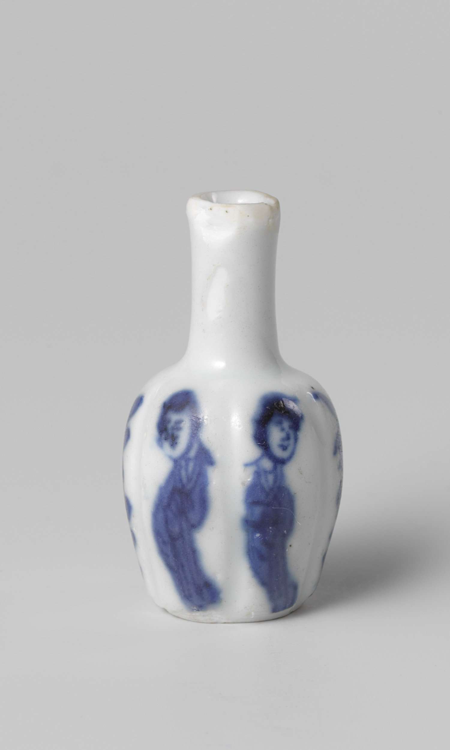 Miniatuur zeslobbige, flesvormige vaas van porselein, beschilderd in onderglazuur blauw. Op de wand zesmaal bloeiende planten en vrouw (lange lijzen). Blauw-wit. (Nederlands)