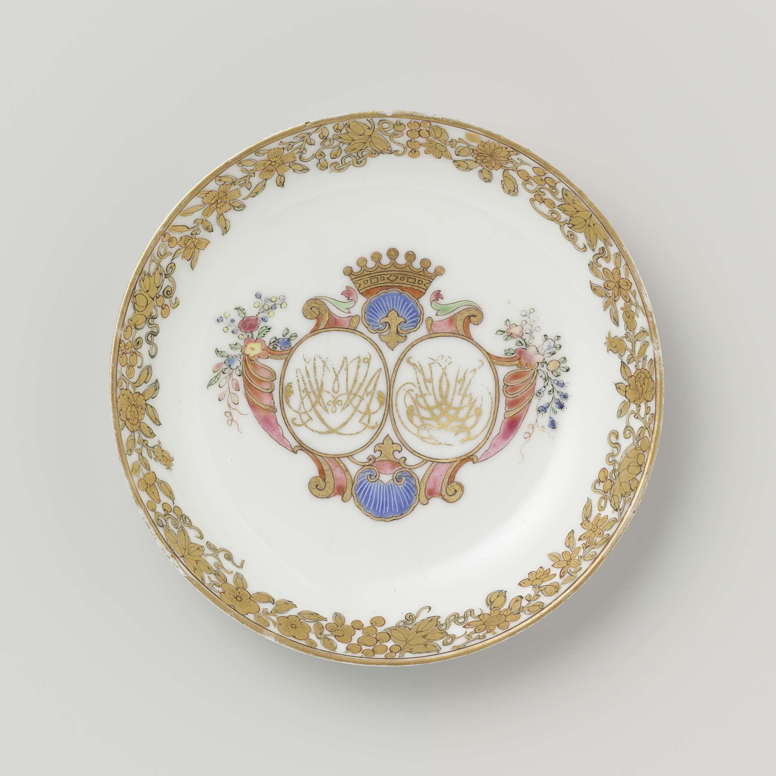 Saucer from the 'Swellengrebel service' with a double crowned monogram and a border with floral scrolls (Engels)
