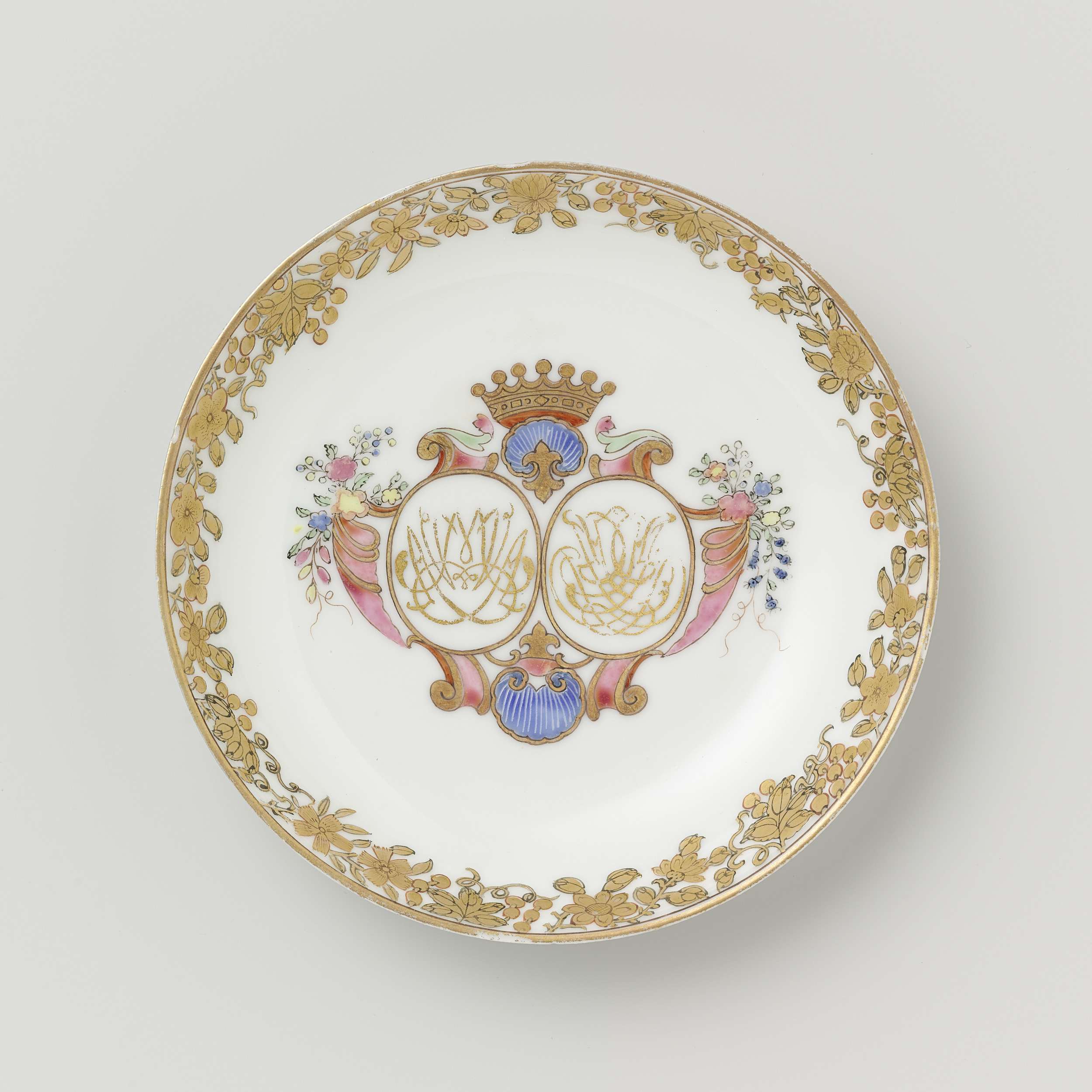 Schotel van porselein, beschilderd op het glazuur in blauw, rood, roze, groen, geel, zwart en goud. Op het plat een gekroond, dubbel spiegelmonogram met 'MVA' en 'CHTD' omgeven door schelpmotieven, krulwerk en bloemtakken; de binnenrand met een band met bloemranken. Een barst en enkele chips in de rand. Europese voorstelling in emailkleuren. (Nederlands)