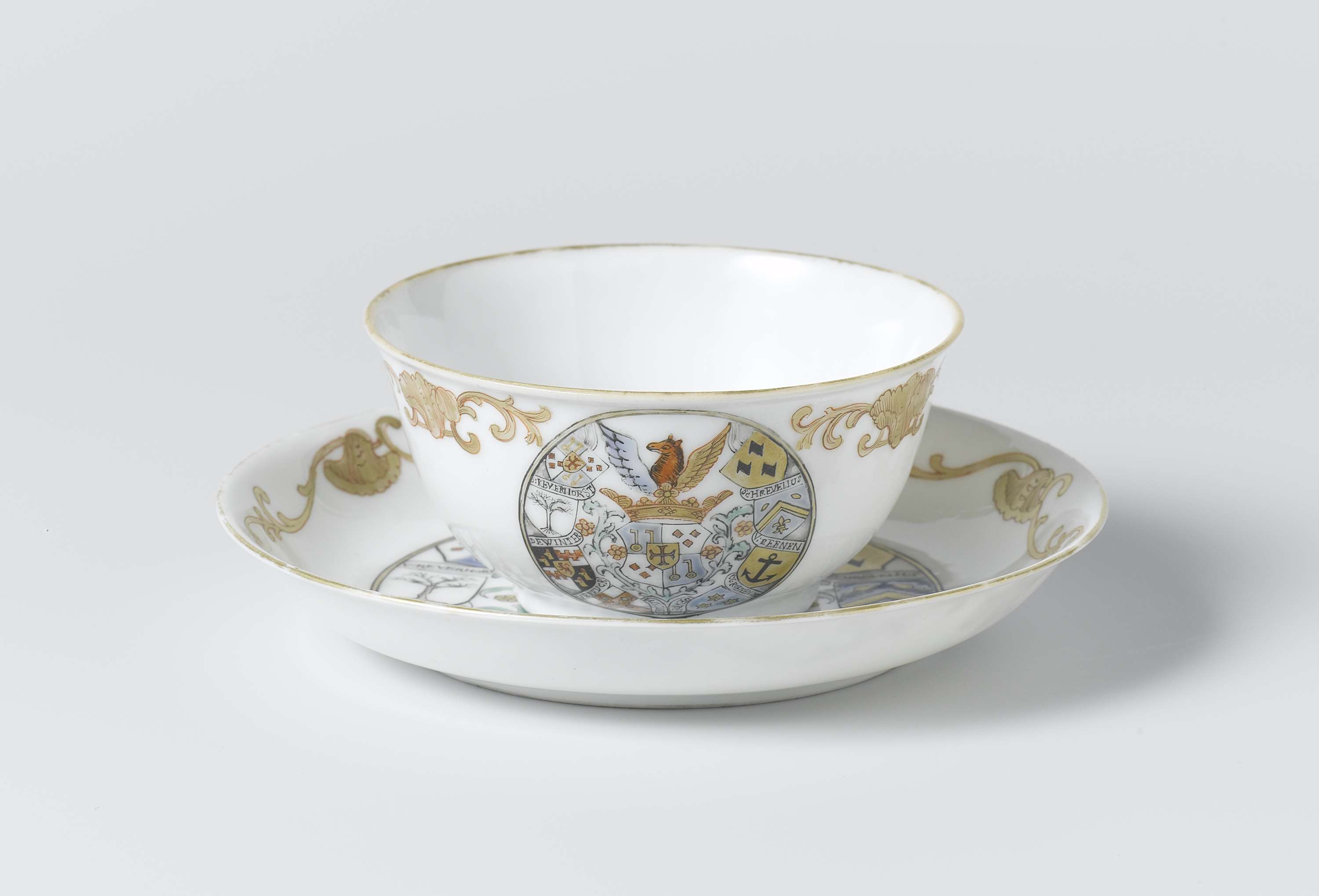 Klokvormige kop en schotel van porselein, beschilderd op het glazuur in blauw, rood, groen, zwart en goud. Op het plat in een medaillon het wapen van de familie Van Reverhorst omringd door andere familiewapens. Het wapen is verdeeld in vier velden: 1. en 4. op een blauwe achtergrond twee sleutels, 2. en 3. op een witte achtergrond drie ruiten in rood. Het helmteken is een paard met vleugels. Het dekkleed bestaat uit groene palmtakken en bloemknoppen. De andere wapens die zijn afgebeeld, van links naar recht: Van Reverhorst, De Winter, Vereyck, De Bruyn, Groenendijk, Van Rhenen, Schrevelius. Het geheel moet de familiestamboom van de familie Van Reverhorst weergeven. Op de binnenrand een Europese ornamentband met schelpmotieven en ranken. De kop met dezelfde decoratie. Wapenporselein met emailkleuren. (Nederlands)