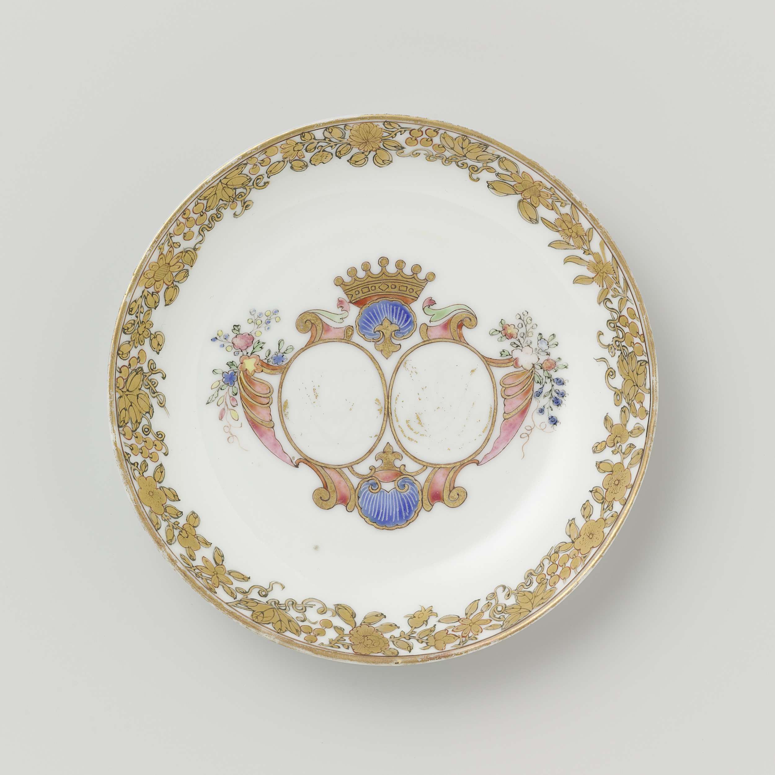 Saucer from the 'Swellengrebel service' with a double crowned monogram and a border with floral scrolls (Engels)