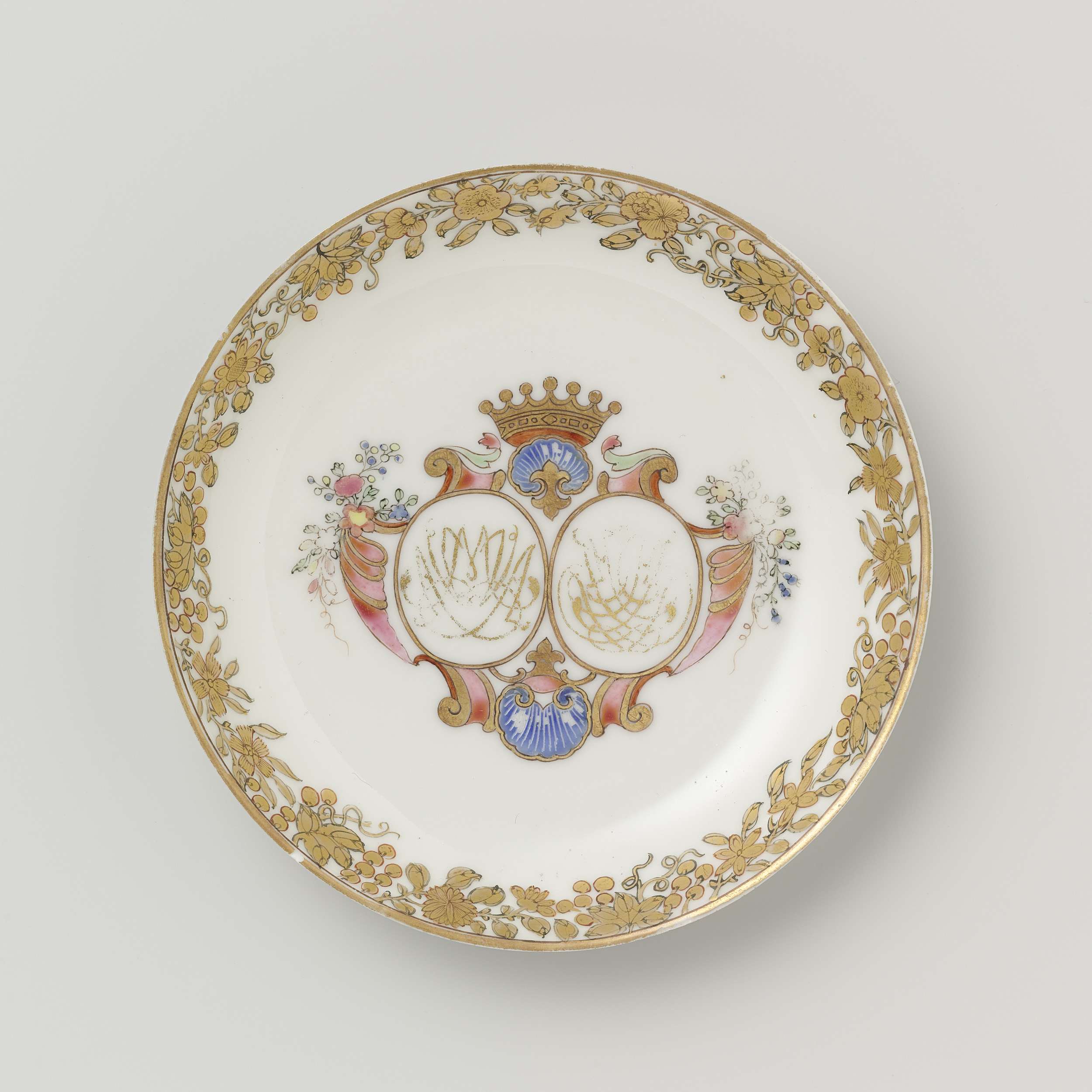 Saucer from the 'Swellengrebel service' with a double crowned monogram and a border with floral scrolls (Engels)