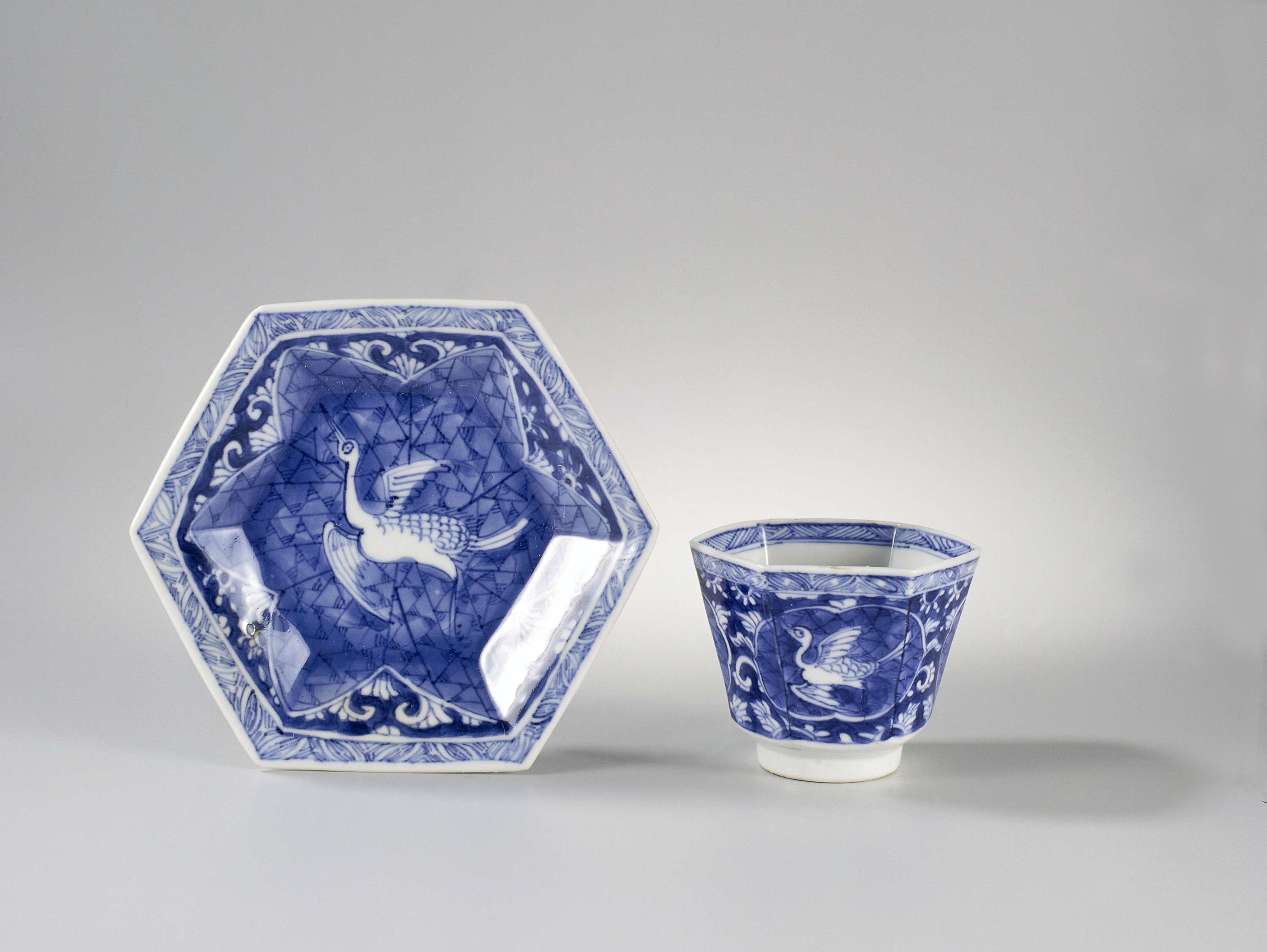 Zeshoekige schotel van porselein, beschilderd in onderglazuur blauw. Op het plat een vliegende kraanvogel tegen een grond van 'crackled-ice' in een stervormig cartouche; om het cartouche heen lotusranken; de rand met een decoratieve band; op de achterzijde vijf kostbaarheden (artemisiablad, parel, rol, ruit, muzieksteen) en een toaïstisch symbool (castagnetten). Gemerkt op de onderzijde met het zegelmerk 'Fú' in een dubbele cirkel. Blauw-wit. (Nederlands)