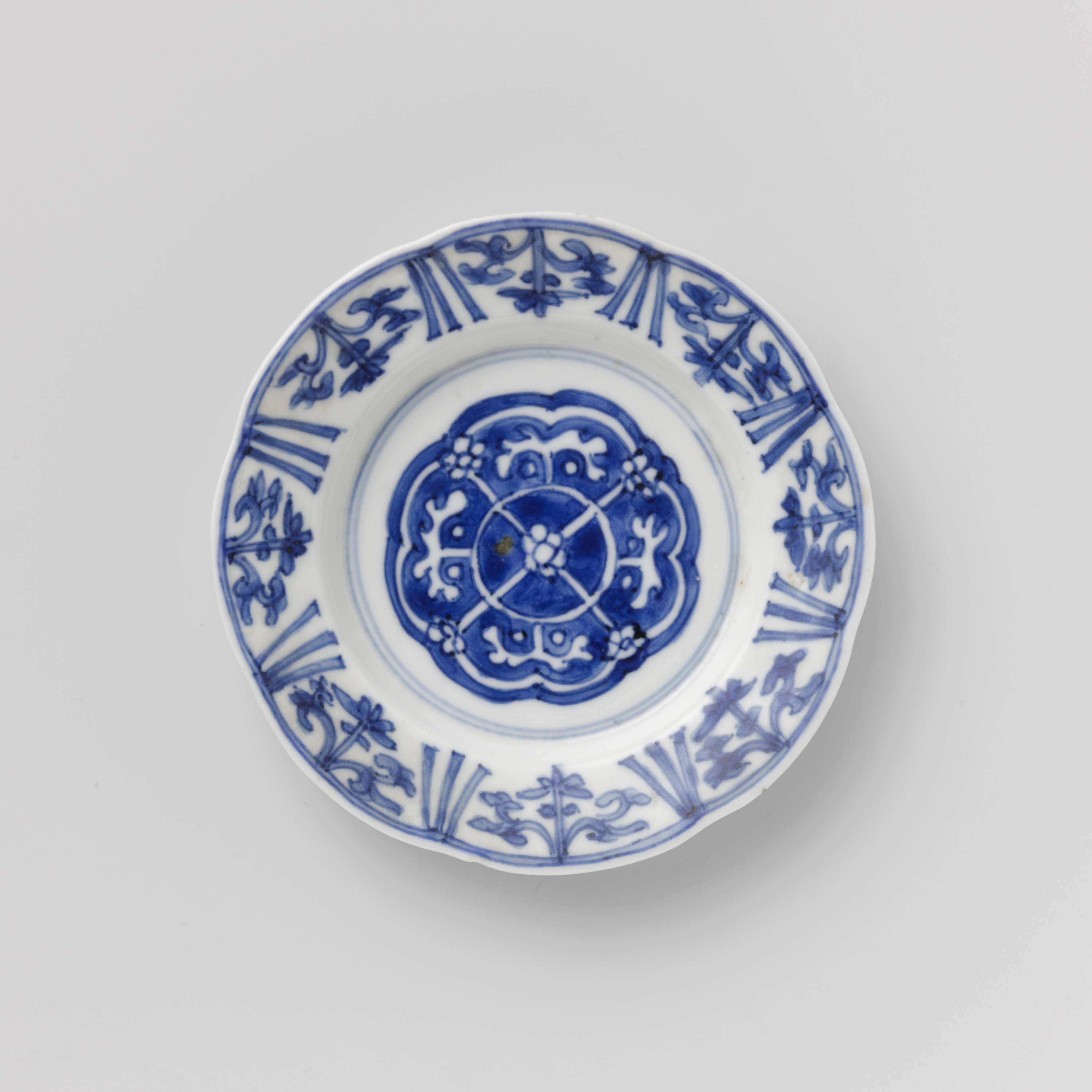 Schotel van porselein met gelobde rand, beschilderd in onderglazuur blauw. Op het plat een rozet met in het centrum een bloem in een cirkel in reserve, vanuit de bloem vier lijnen met op het eind een bloem in reserve, op de cirkel takken in reserve; op de rand gestileerde bloemranken afgewisseld met drie lijnen; de achterzijde met vier kostbaarheden (parel, ruit, artemisiablad, rol). Gemerkt op de onderzijde met het vier-karaktermerk van keizer Yongzheng (?) in een dubbele cirkel. Blauw-wit. (Nederlands)