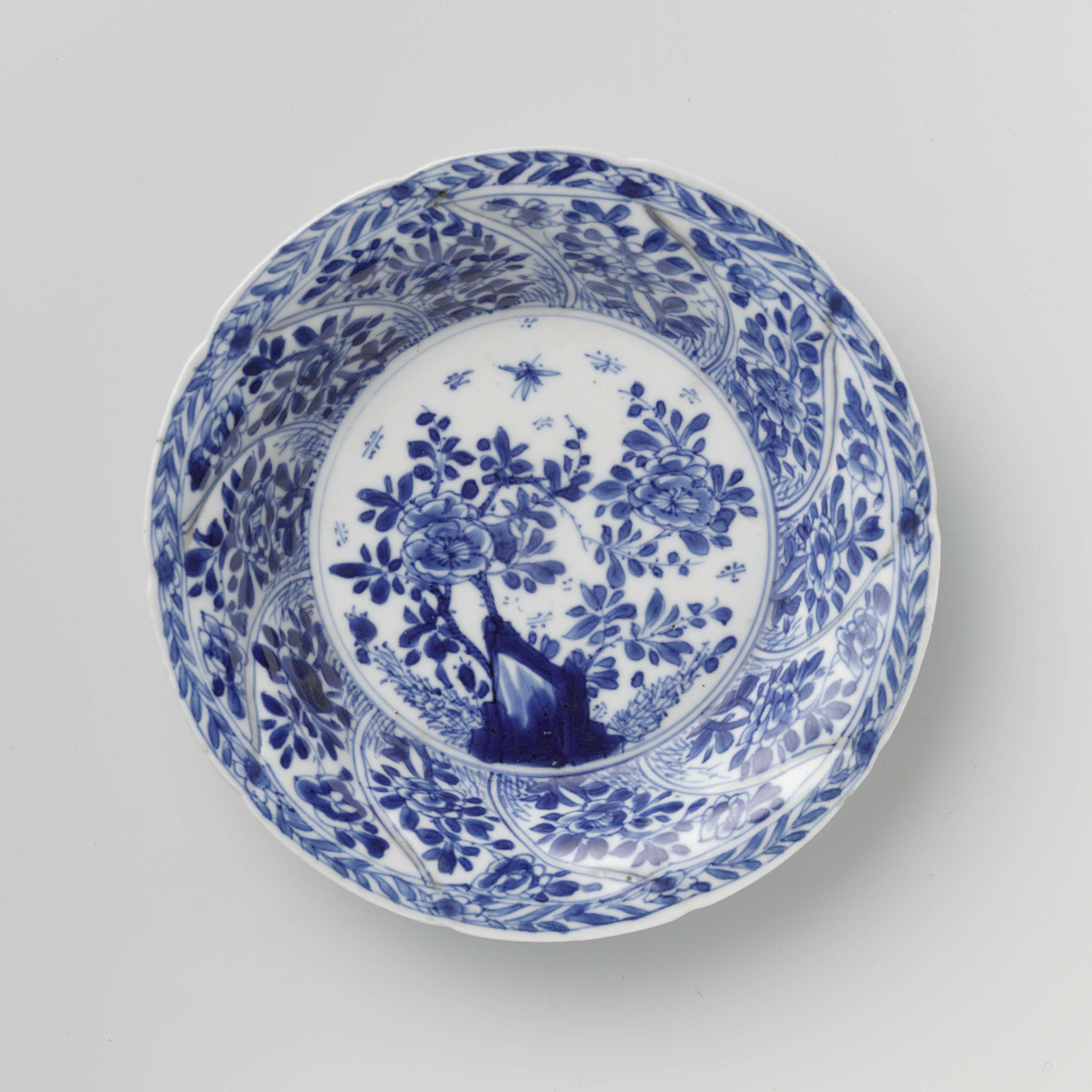 Schotel van porselein met ronde wand gemodelleerd in tien getordeerde vakken, beschilderd in onderglazuur blauw. Op het plat een rots met een bloemtak, planten en vlinder; op de wand in elk vak een bloemtak; de rand met een bloemrank; op de achterzijde tevens in elk vak een bloemtak. Gemerkt op de onderzijde met het Chinese karakter 'Fú' in een dubbele cirkel. Een chip in de rand. Blauw-wit. (Nederlands)