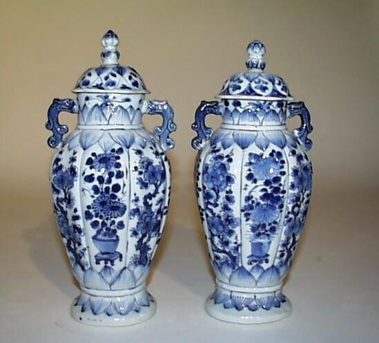 De gecontourneerde en afgeplatte vazen zijn balustervormig en hebben draakvormige oren, een concaaf-conische ovale voet en een wijd klokvormig deksel met een bloemknopvormige knop. Op de buik bevinden zich zes cartouches met decors van bloeiende (pot)planten. Boven de voet en rond het begin van de hals loopt een witte band in reliëf met aan weerszijden banden met gecontourneerde lotusbladen. Onder de monding bevindt zich een decor van bloemenranken. Het deksel is gedecoreerd met bloemen en bladvormige cartouches waarin bloemen. Rond de knop loopt een band met lotusbladen. (Nederlands)