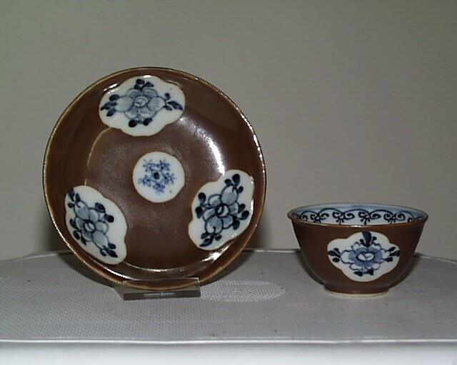De gewelfde schotels hebben een standring en een kapucijner binnenwand met een centraal floraaldecor in een ronde uitsparing en drie bloemvormige uitsparingen met elk een bloem. De omgekeerd klokvormige kommen hebben een standring en op het plat een decor van een kleine bloem, met langs de rand pijlpuntversieringen. De kapucijner buitenwand heeft drie bloemvormige uitsparingen met elk een bloem. (Nederlands)