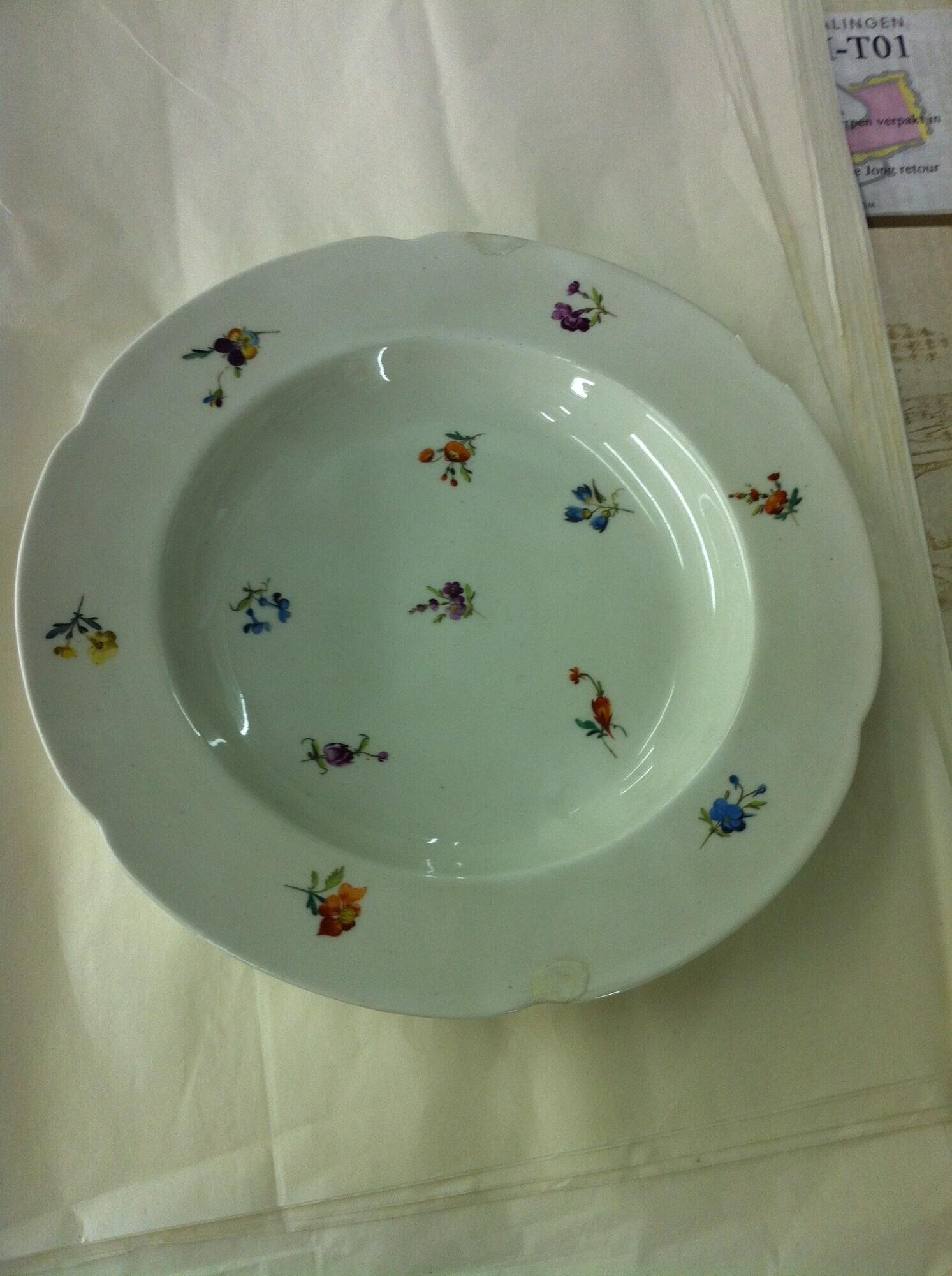 diep bord. Zeslobbige rand. Decor van diverse bloempjes polychroom opglazuur. (Nederlands)