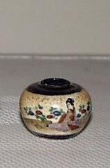 porselein? ; decoratie in Satsuma-techniek in blauw, groen, rood, lila, zwart en goud (Nederlands)