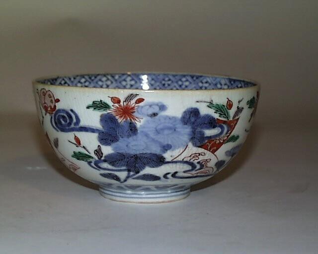 decor blauw onderglazuur, groen en violet email, ijzerrood en goud opglazuur, bloemen, vlinders, ornamentale randen (Nederlands)