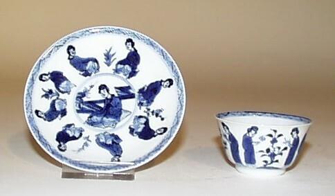 een schotel met een karaktermerk (in dubbele ring) shou (lang leven); een schotel met zeskaraktermerk (in dubbele ring): qi yu bao ding zhi zhen (dierbaar voorwerp van zeldzaam jade te midden van gekoesterde vaten); de koppen met slecht leesbaar vierkaraktermerk, mogelijk Cheng Hua. (Nederlands)