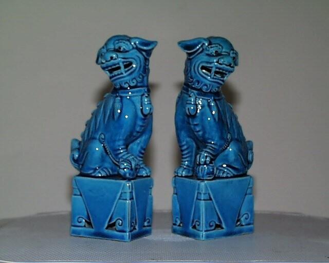De sculptuur verbeeld een boeddhistische leeuw met gekrulde manen gezeten op een kubusvormige sokkel met driehoekige versieringen en ajourwerk. Het vrouwtje (links op de foto) heeft een jong onder de rechter voorpoot. (Nederlands)