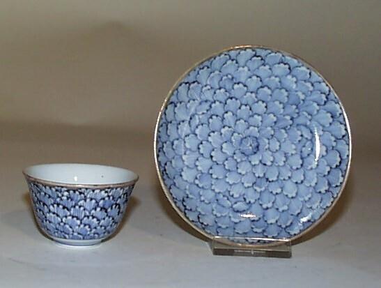 vijf koppen en zes schotels. Het decor bestaat uit tekeningen van bladeren, die op de buitenkant van de koppen en aan de bovenrand van de schotels, een bloem (chrysant) uitbeelden, binnenkant van het kopje met motief, de bovenranden zijn met goud afgewerkt. Decor (blauw onderglazuur) bestaat uit: tekening van blaadjes, die op de gehele buitenkant van de kopjes, en op de bovenkant van de schoteltjes een bloem (vermoedelijk chrysant) uitbeelden. Binnenkant kopje met motiefje. (Nederlands)