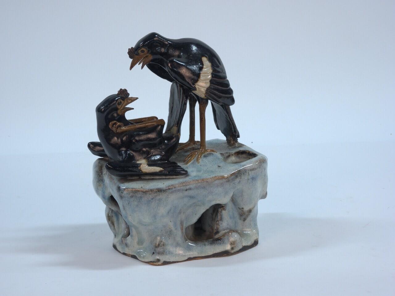 Chinese bloempot, geglazuurd aardewerk, met min of meer vierkant voetstuk. Gebobbeld zijoppervlak met ronde en langwerpige gaten. In het bovenvlak een rond gat en op dat vlak twee vechtende vogels, eveneens van aardewerk. Zwart, met een streep wit in de veren, gele bek en poten. De ene op de rug liggend, de tweede voor de andere staande, beide met de bekken open om te pikken. (Nederlands)