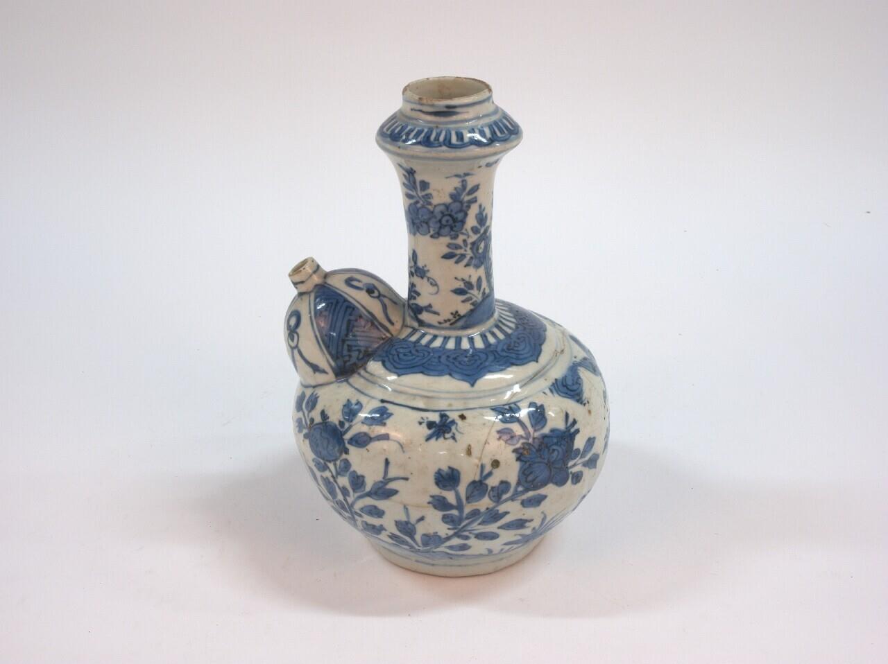mogelijk antieke, Chinese waterkruik ; blauwe figuren op licht fond ; planten met bloemen, vogels, insecten, lintjes en geometrische figuren ; glazuur hier en daar gebarsten (Nederlands)