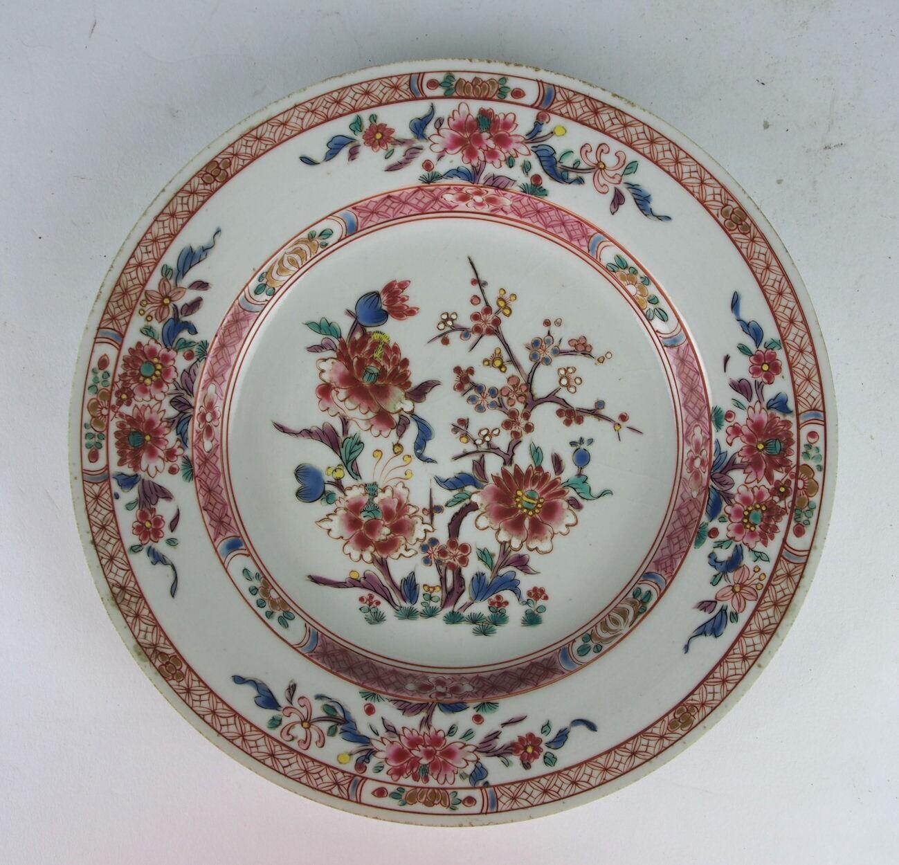 porselein, famille rose-techniek (geel, blauw, groen, roze, bruinrood, magenta, zwart), bovenglazuur (goud), kapucijner rand (Nederlands)