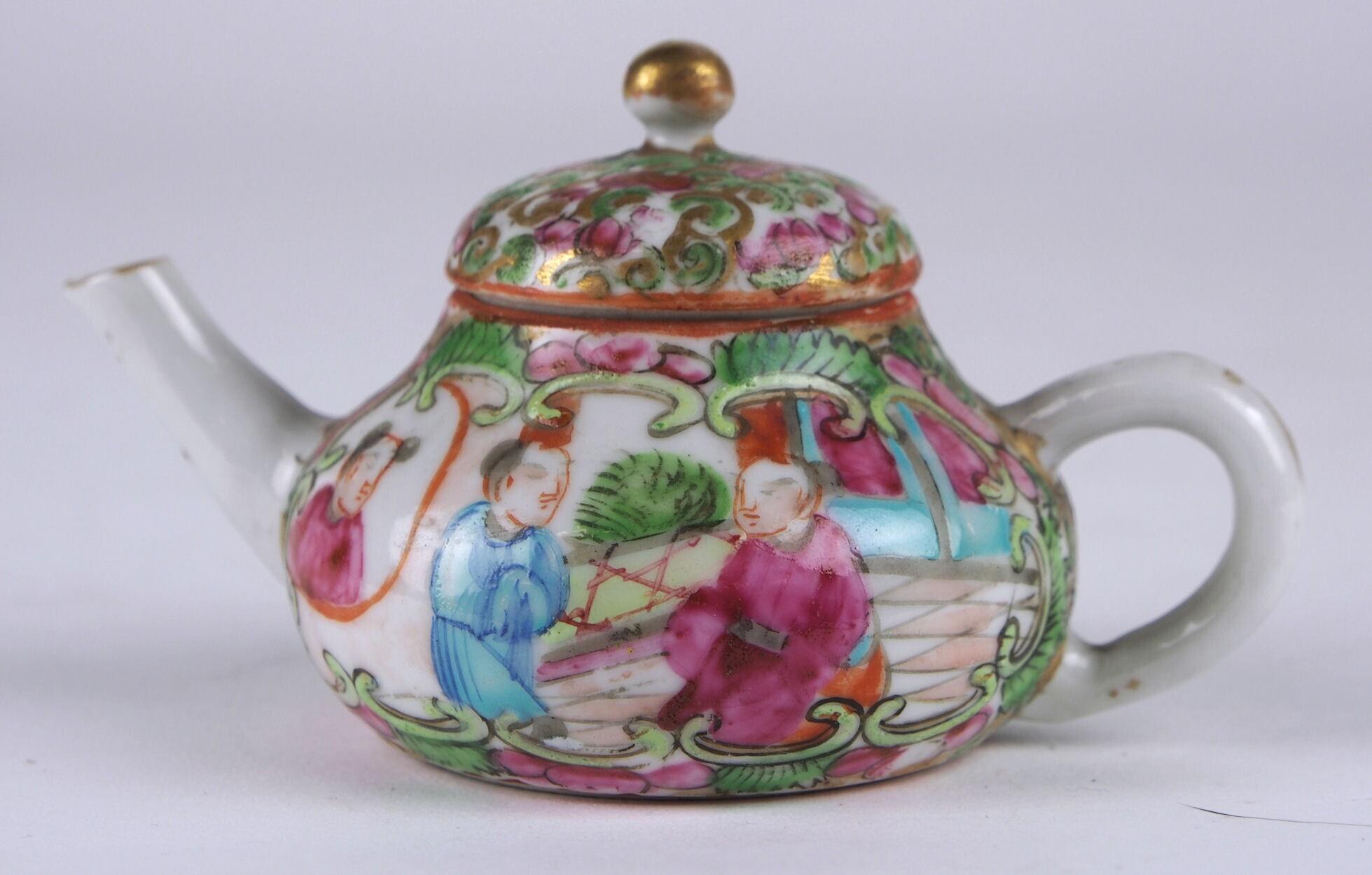 porselein, zogenoemde mandarijnendecoratie in famille rose-techniek (geel, blauw, groen, roze, oranje, paars), bovenglazuur (goud) (Nederlands)