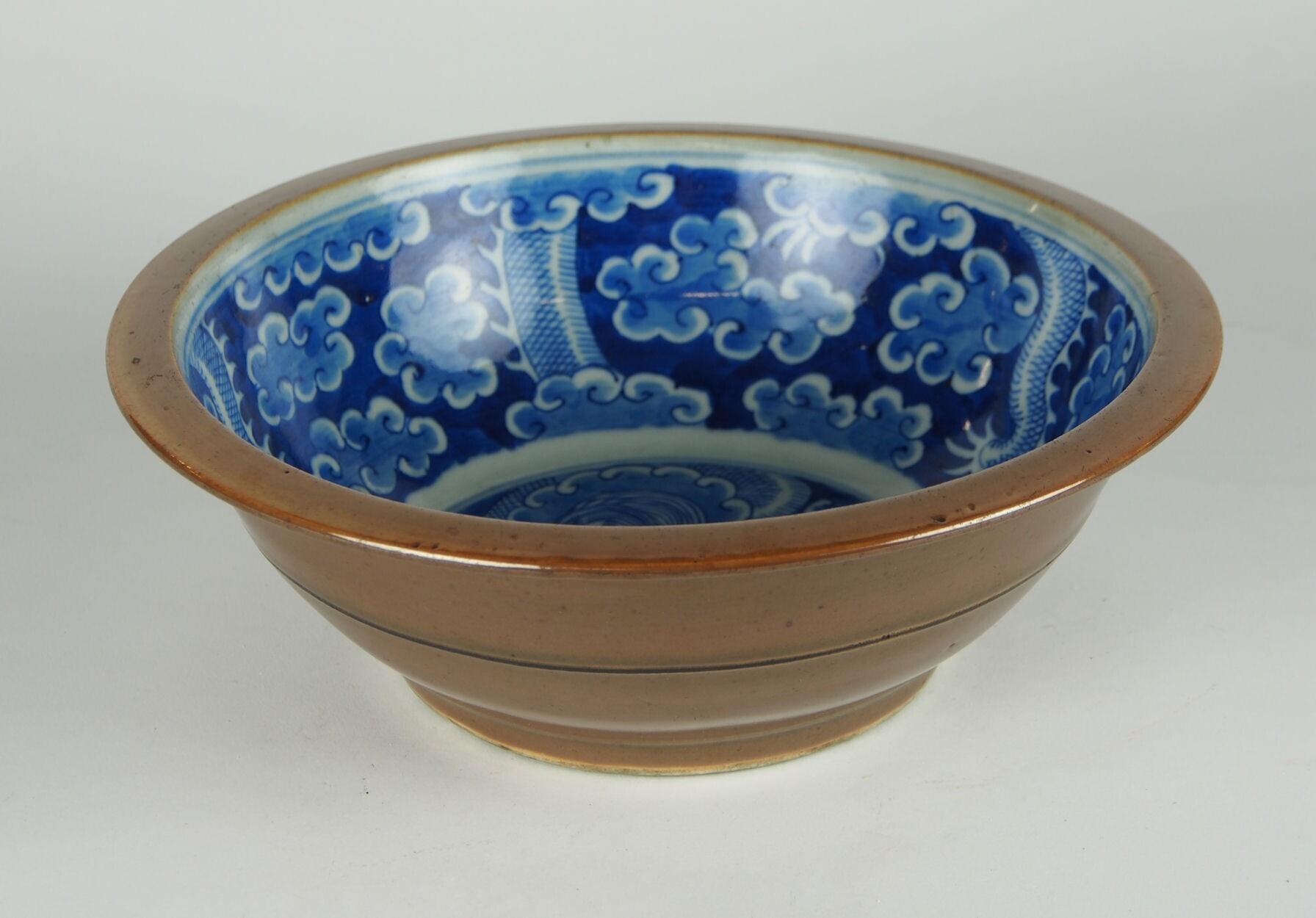 De kom is convex-conisch van vorm en heeft een standring en een smalle, vlakke, overkragende rand. Het plat heeft, binnen een witte cirkel, een decor van gestileerde wolken en een vierklauwige draak die op een vlammende parel jaagt. De binnenwand is gedecoreerd met gestileerde wolken en een draak. (Nederlands)