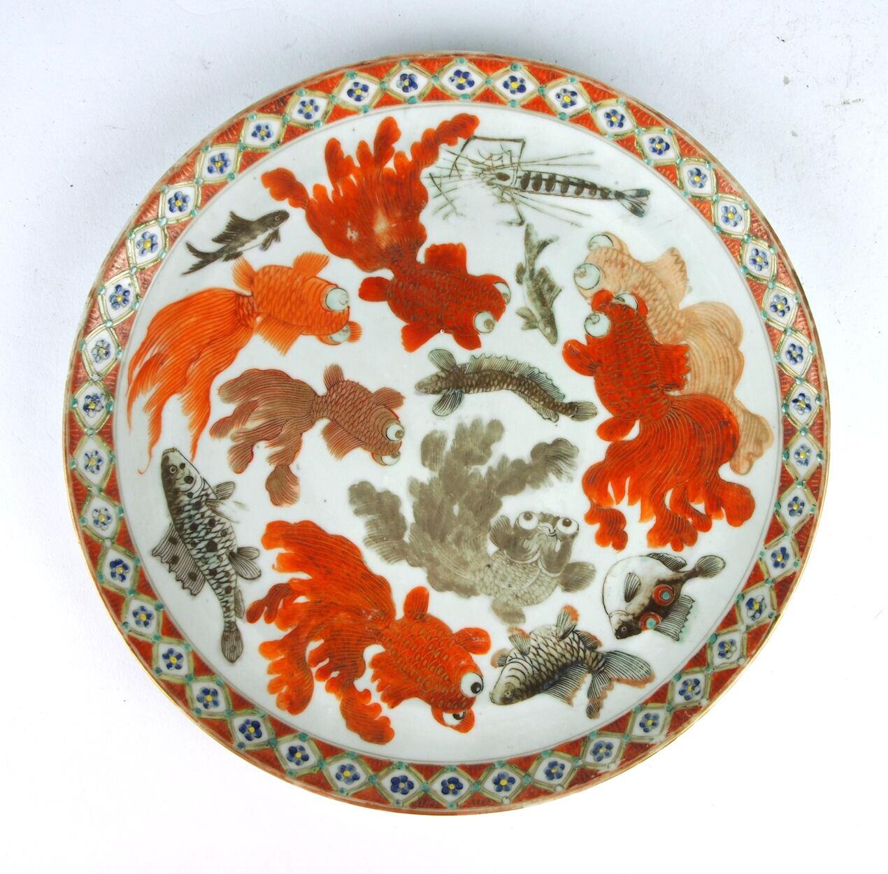 Het bord heeft een schuine standring en een concave rand. Het bord heeft een decor van vissen, waaronder goudvissen met pluimstaarten en uitpuilende ogen, en een kreeft. Langs de rand loopt een band met ruitvormig servetwerk waarin zich bloempjes bevinden. (Nederlands)
