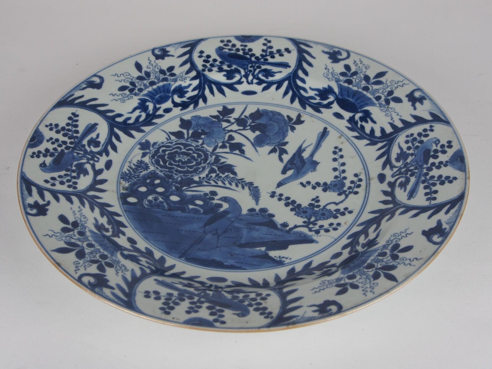 De schaal heeft een standring en een brede, schuin oplopende rand. Het plat heeft, binnen een dubbele cirkel, een decor van rotsen met bloeiende planten en twee vogels. De rand is gedecoreerd met door rankwerk begrensde cartouches, waarin zich afwisselend een mand met een plant en een vogel op een tak bevinden. De buitenwand heeft een decor van drie bloemenranken. (Nederlands)