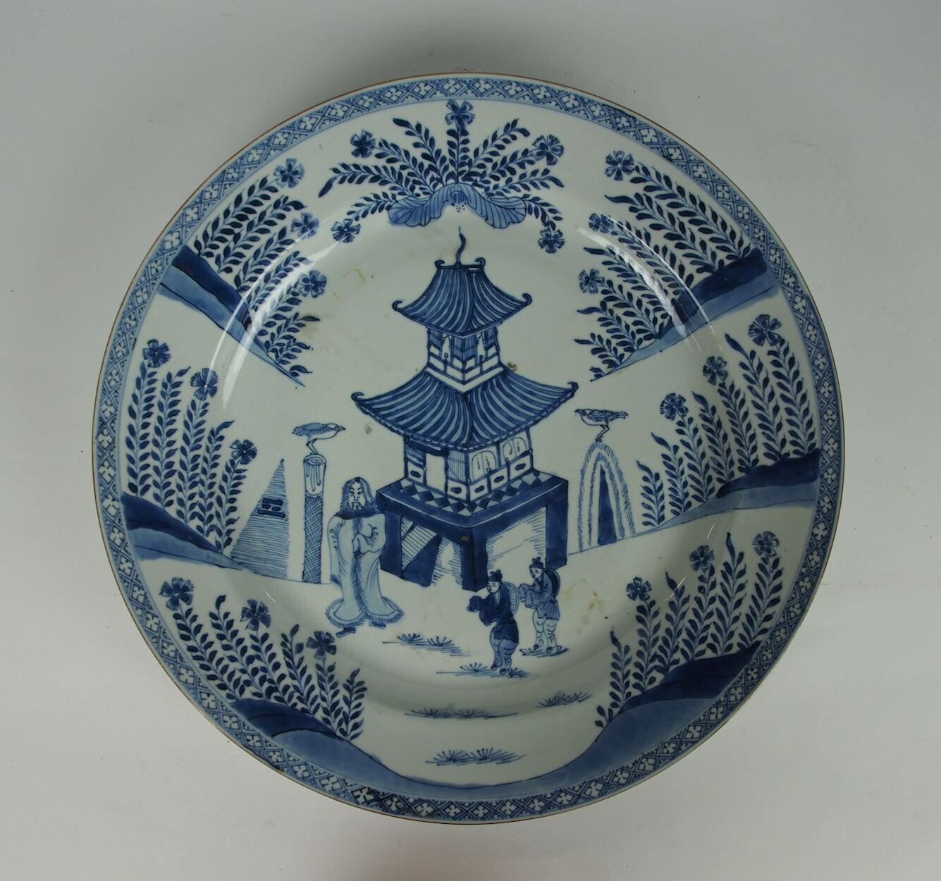 Drie oosterse figuren staand voor een pagode. Links en rechts een vogel op stok. Bladdecoratie aan de rand. Herhalend patroon van ruiten aan buitenste rand. (Nederlands)