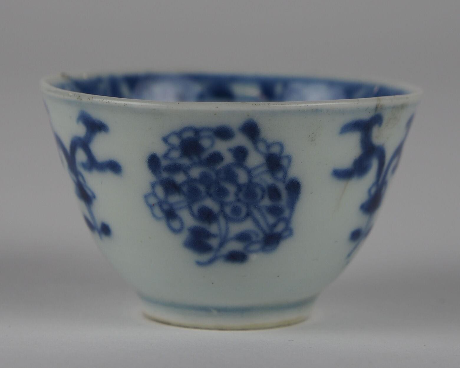 de kop heeft een omgekeerde klok vorm met een standring. op het plat staat een bloem afgebeeld. langs de binnenrand is een decoratieve cirkel zichtbaar. (Nederlands)