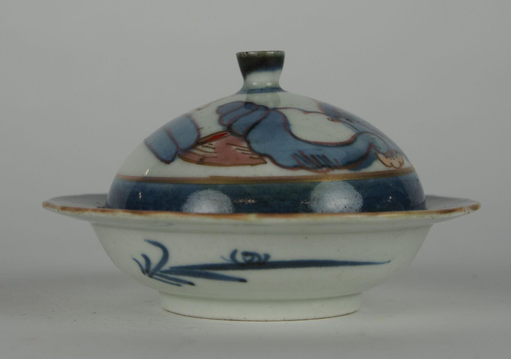 porselein ; imari-techniek (blauw, roze, rood) ; bovenglazuur (goud) (Nederlands)
