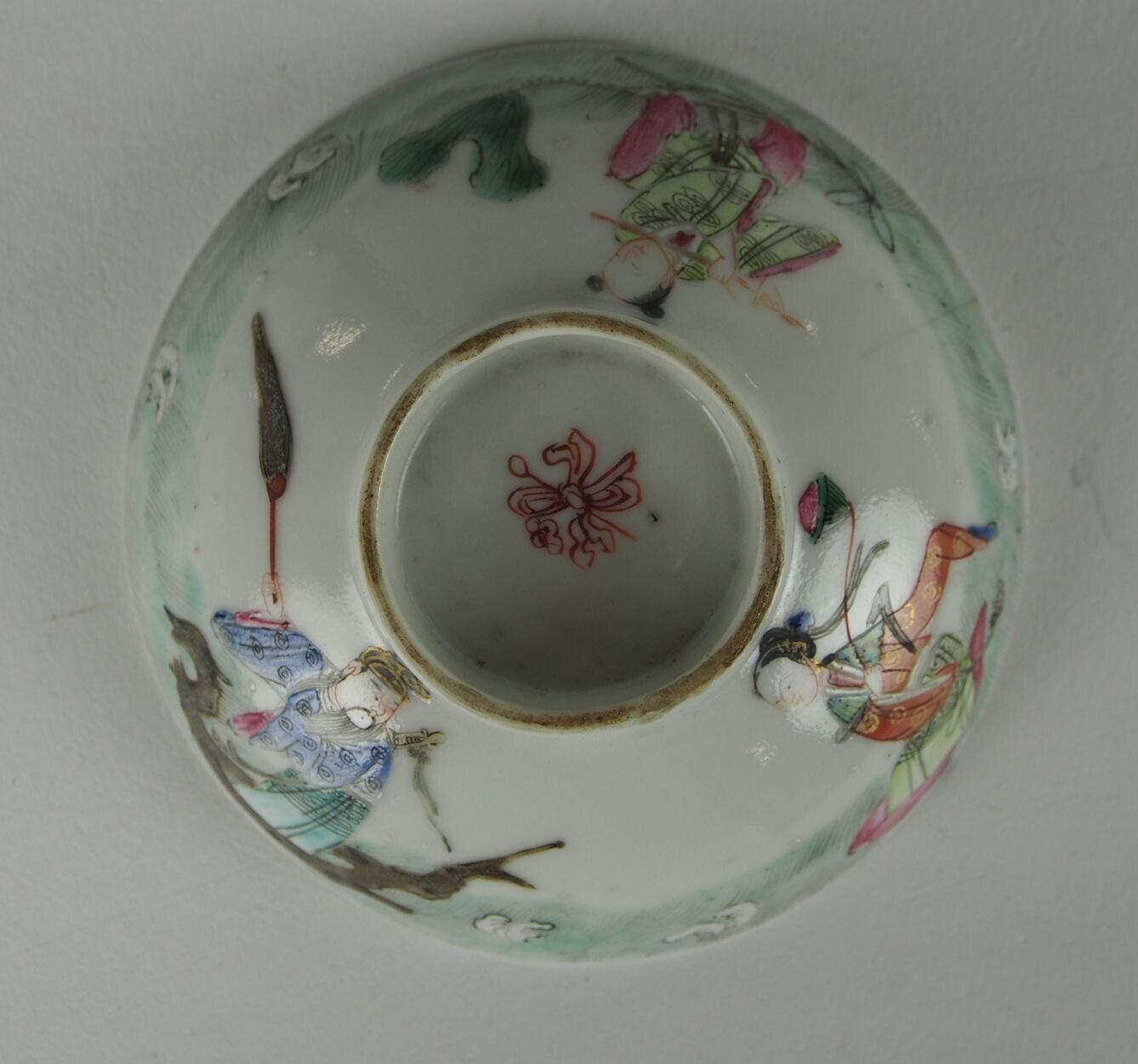 Het theekommetje is convex-conisch van vorm en heeft een standring en een geschulpte rand. De kom is gedecoreerd met een landschap waarin een staande man, een ruiter te paard, een oude man met een stok, en een man met een waaier, die op een krab staat. Het deksel is gewelfd en heeft een ring als knop. De kom is gedecoreerd met drie oosterse figuren in een landschap. (Nederlands)