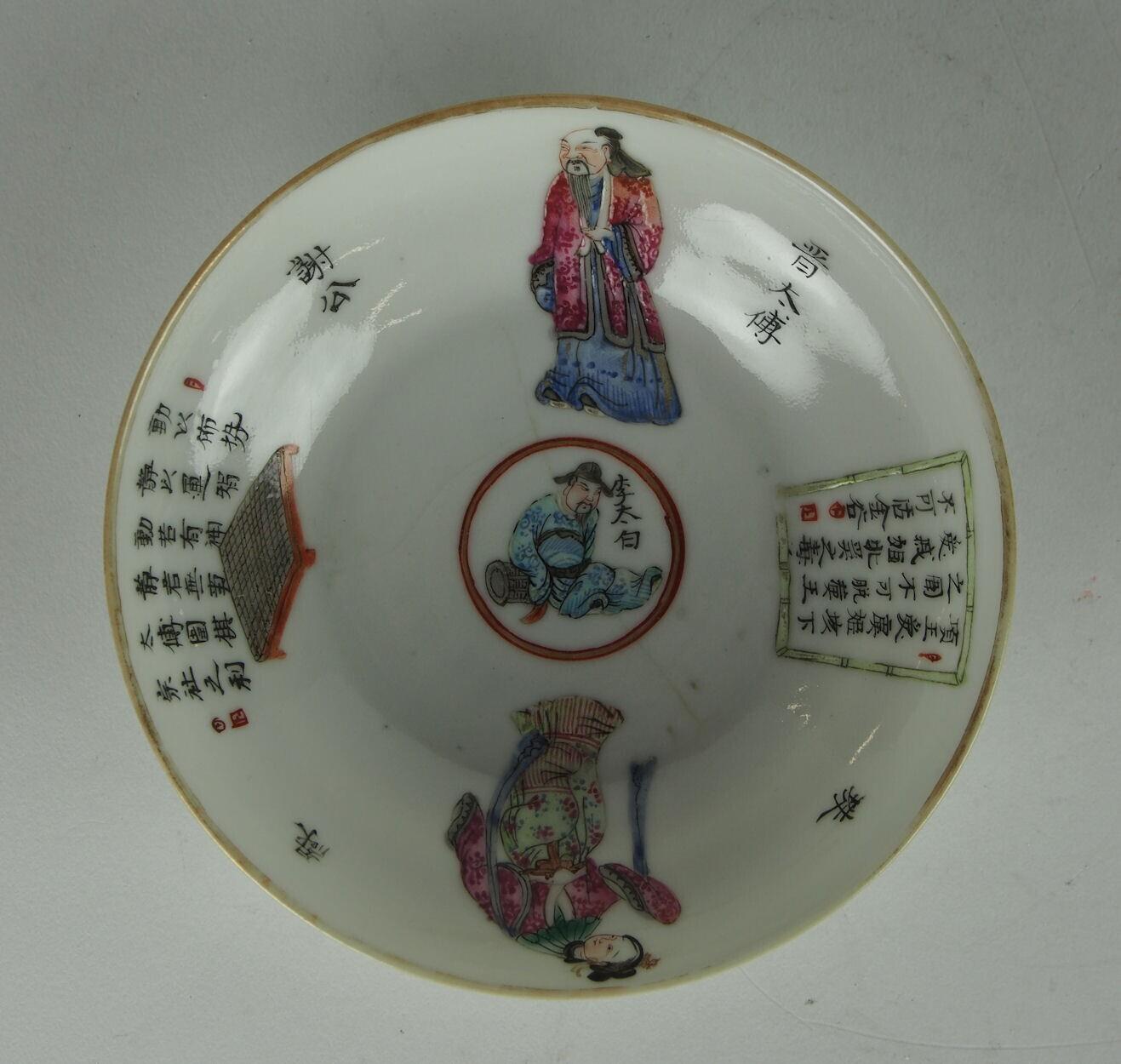 Het schoteltje heeft een standring en een brede, holle rand. Het plat heeft, binnen een dubbele cirkel, een decor van een Chinese tekst en de rustende wijsgeer Li Tai Poh met een rolkussen. Daaromheen bevindt zich een decor van een staande oosterse heer, een rustbed waarboven een tekst, een staande oosterse dame en een tekst in een bamboekader. Tussen de decors staan Chinese karakters. (Nederlands)