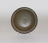 De schaal is gewelfd en heeft een schuin oplopende rand en een standring. (Nederlands)