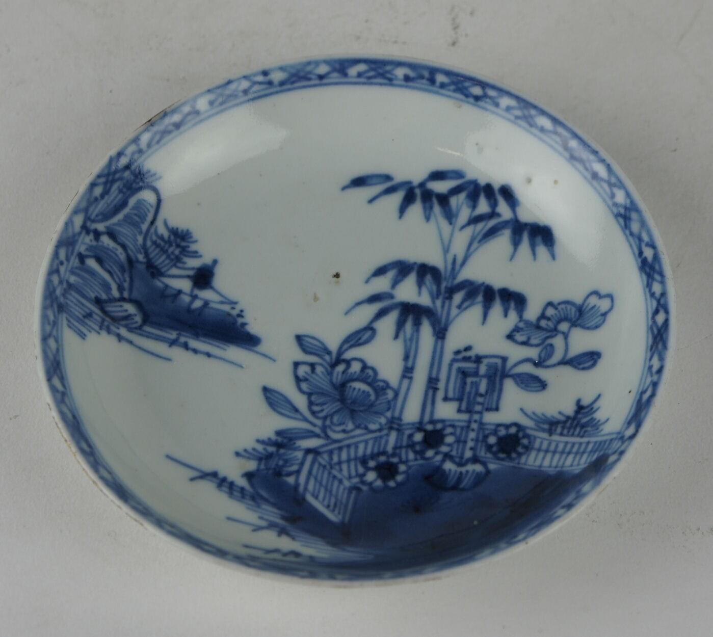 Het schoteltje is gewelfd en heeft een standring. Het schoteltje heeft een decor van een rivierlandschap met rotsen, bomen, een afdakje, een oevertuin met een hekje, een rots, bloeiende planten, waaronder pioenroos en een bamboeplant. Langs de rand loopt een band met ruitvormig servetwerk. (Nederlands)