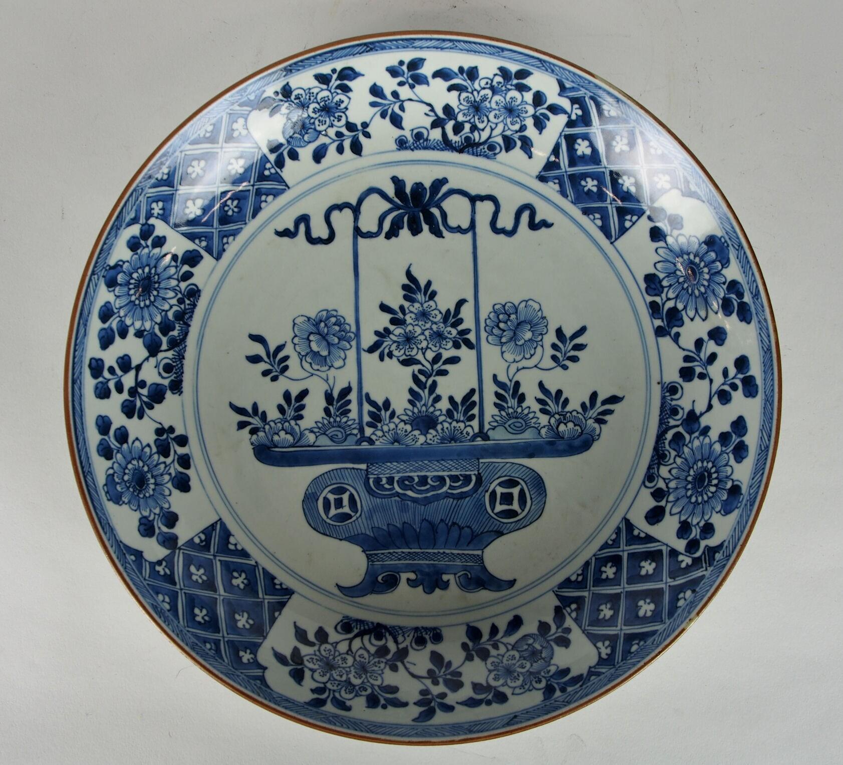 De gewelfde schotel heeft een standring en een rand met lip. De binnenzijde heeft, binnen een dubbele cirkel, een centraal decor van een met ru-yi-koppen, munten en strikwerk versierde mand met bloemen, een zogenoemd Hanakago-motief. De wand is gedecoreerd met ruitvormig servetwerk met bloempjes, waarin zich geschulpte cartouches met alternerende bloemenranken bevinden. (Nederlands)