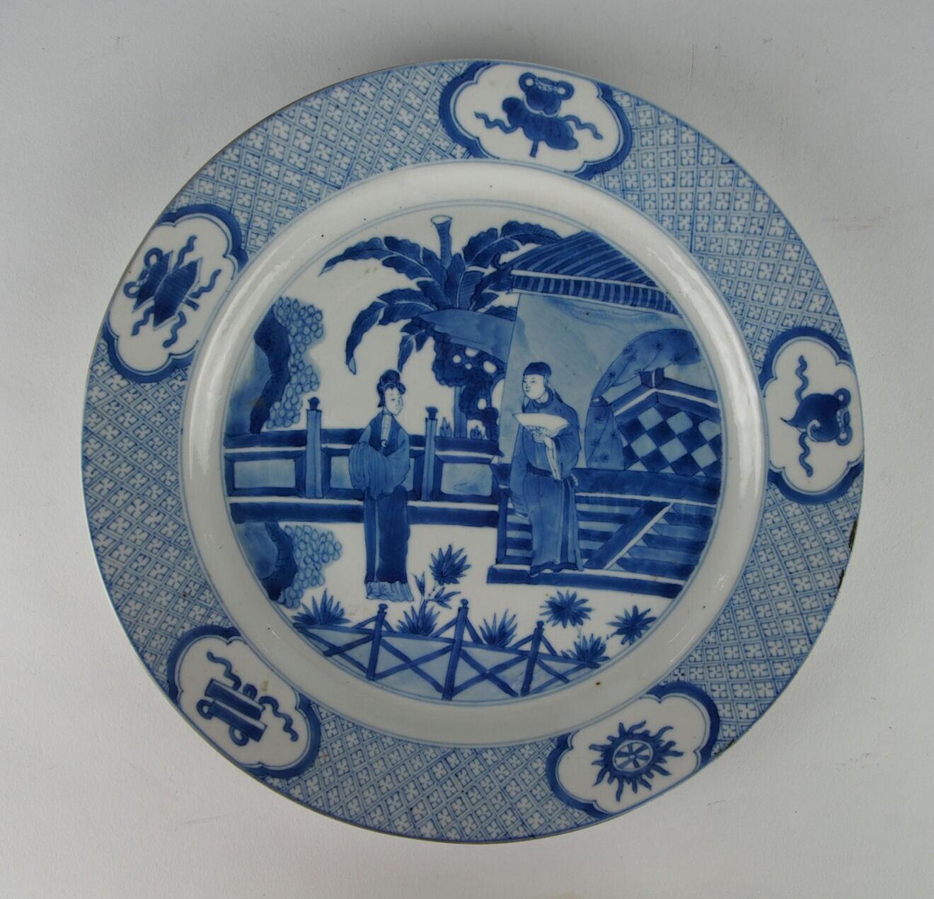 Het bord heeft een standring en een brede, licht oplopende rand. Het plat heeft, binnen een dubbele cirkel, een decor van een huis en een tuin met hekjes, een bananenplant, kleine planten, een op een trapje zittende oosterse heer met een waaier en een staande dame. De rand is gedecoreerd met bloemvormig servetwerk met daarin vijf geschulpte cartouches met boeddhistische symbolen w.o. het wiel en de schelp. De buitenrand heeft een decor van twee rivierlandschappen en twee bootjes met een visser./ Plate decorated with two Chinese figures in a garden, the shape is based on a European pewter plate. (Nederlands)