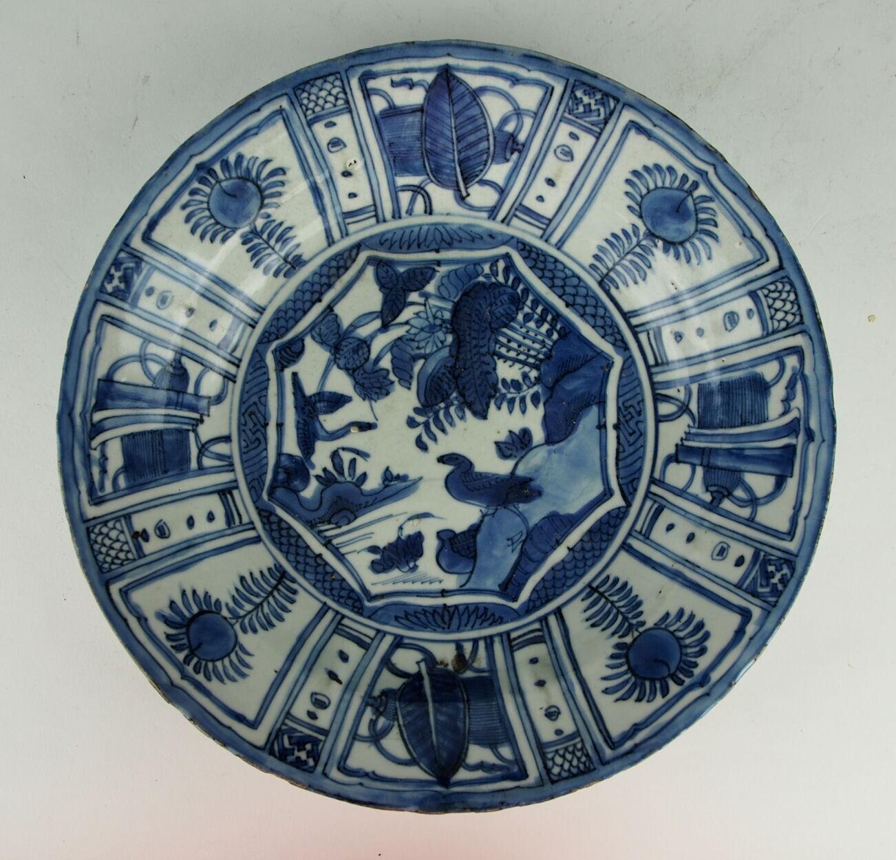 Deze schotel van kraakporselein heeft een standring en een brede, schuin oplopende rand. Het plat heeft, binnen een stervormige cartouche, een decor van een rivieroever met rotsen, bloeiende planten en twee eenden. Tussen de ring rond het plat en het centrale decor bevinden zich acht accoladevormige cartouches met alternerend servetwerk. De rand heeft acht cartouches met afwisselende decors van perzikbloesem en boeddistische symbolen, waaronder palmbladeren en boekrollen. Tussen de cartouches bevinden zich smalle panelen met vier parels tussen afwisselend servetwerk. De buitenwand is gedecoreerd met zes ronde cartouches met een parel, waartussen smalle vlakken met een gestileerde lingzhi. (Nederlands)