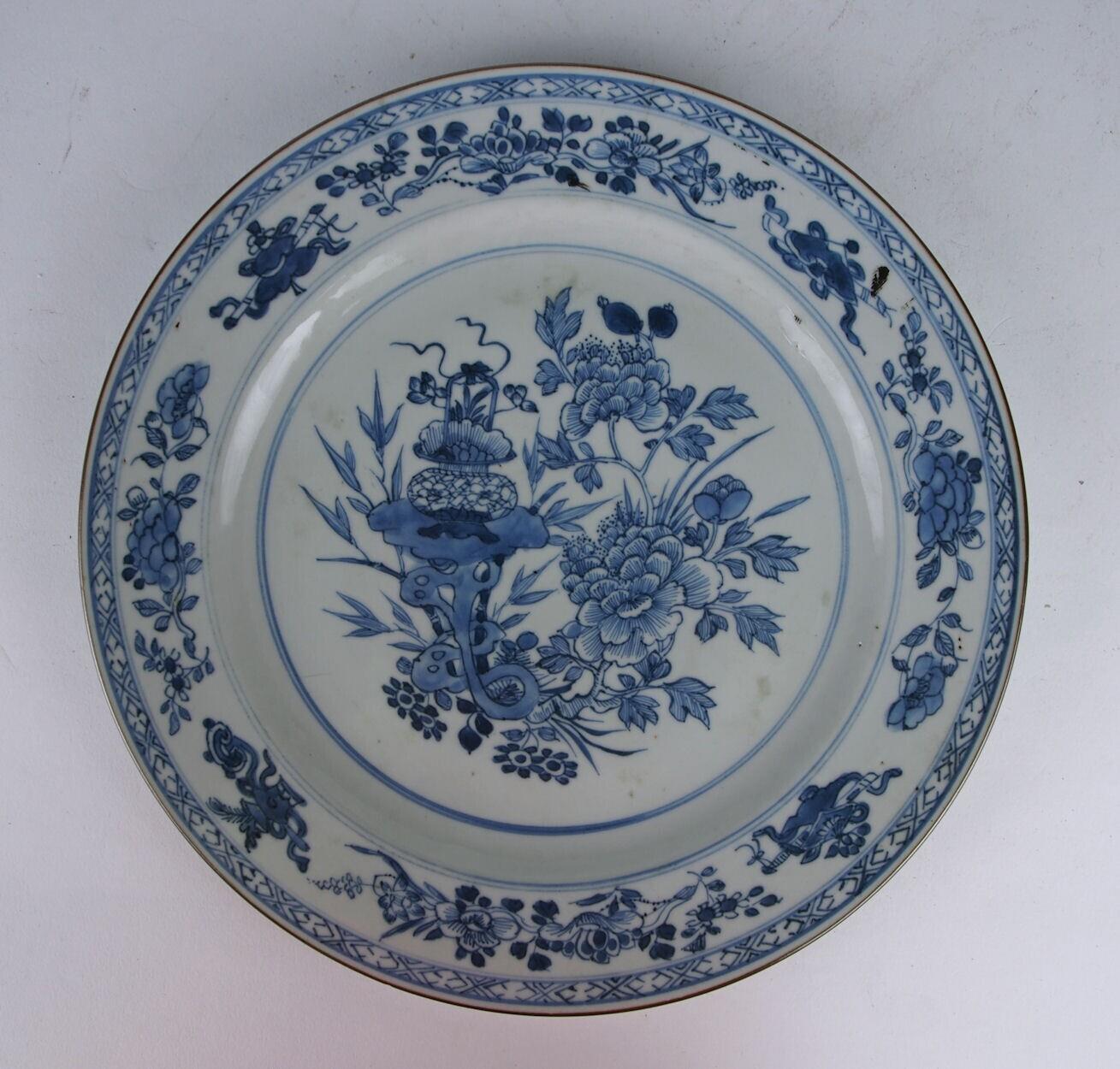 Het bord heeft een schuine standring en een brede, licht oplopende rand. Het plat heeft, binnen een dubbele cirkel, een decor van een bloemenmand op een rots en bloementakken, waaronder pioenroos. De rand heeft een decor van afwisselend bloesemtakken en kostbaarheden. Langs de rand loopt een band met bloemvormig servetwerk. De buitenrand heeft een decor van twee bloemenranken. (Nederlands)