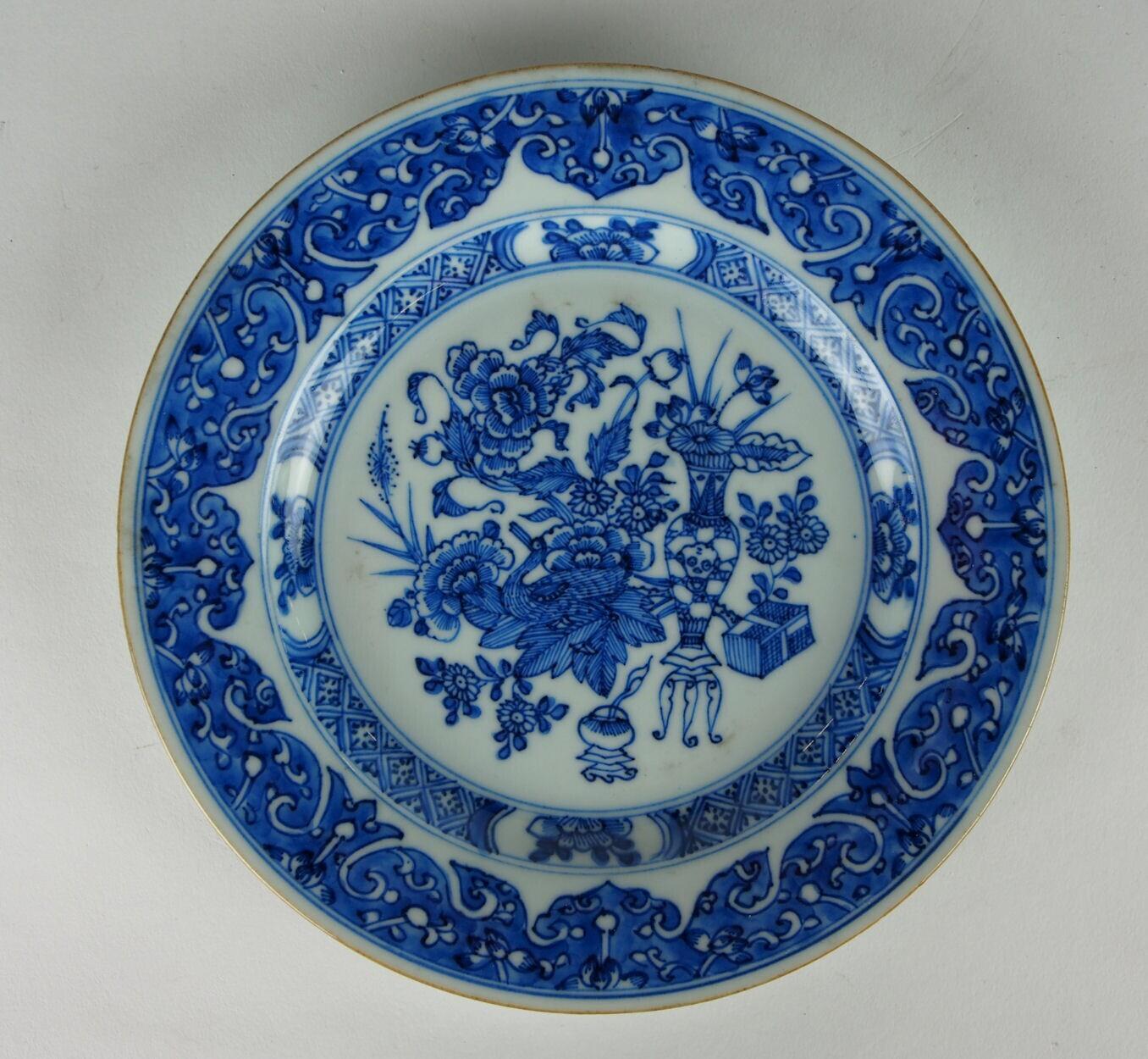 Het borden heeft een schuine standring en een brede, licht oplopende rand. Het plat heeft, binnen een dubbele cirkel, een decor van een bloemenvaas, een wierookvat, een kistje en bloementakken, waaronder pioenroos. De vertreding heeft een band met servetwerk met daarin vier ovale cartouches met elk een bloem. De rand heeft een band met grillige versiering. Verkleuring langs de rand. (Nederlands)