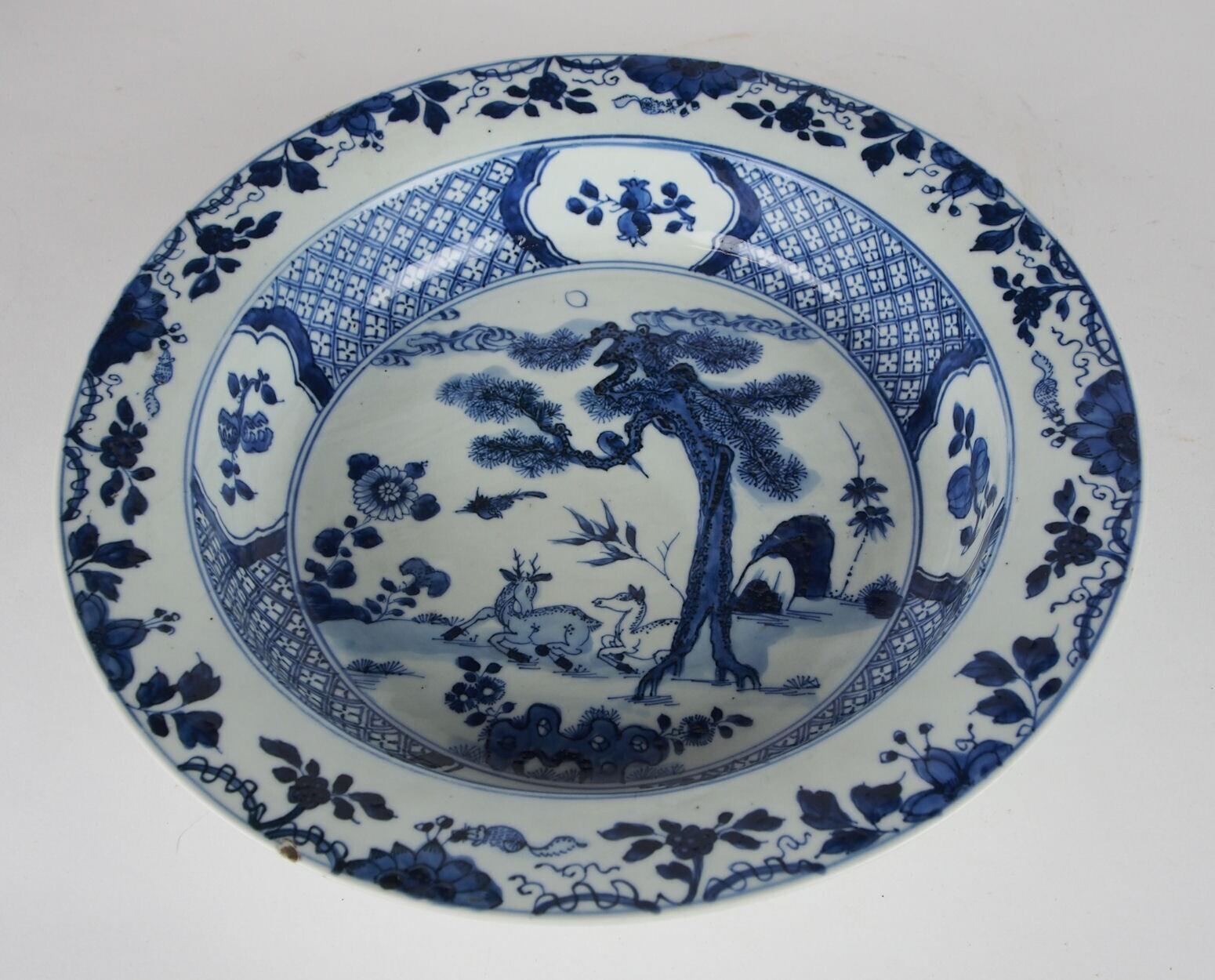 Het bassin heeft een standring en een licht oplopend rand. Het plat heeft, binnen een dubbele cirkel, een decor van een landschap met de zon, wolken, rotsen, bloeiende planten, een boom, een vliegend insect en een liggend hertenpaar. Op de vertreding loopt een band met swastikavormig servetwerk waarin zich vier bloemvormige cartouches met diverse vruchtentakken bevinden. De rand is gedecoreerd met bloemenranken met daartussen vier op noten knabbelende eekhoorntjes. Wat randschade. (Nederlands)