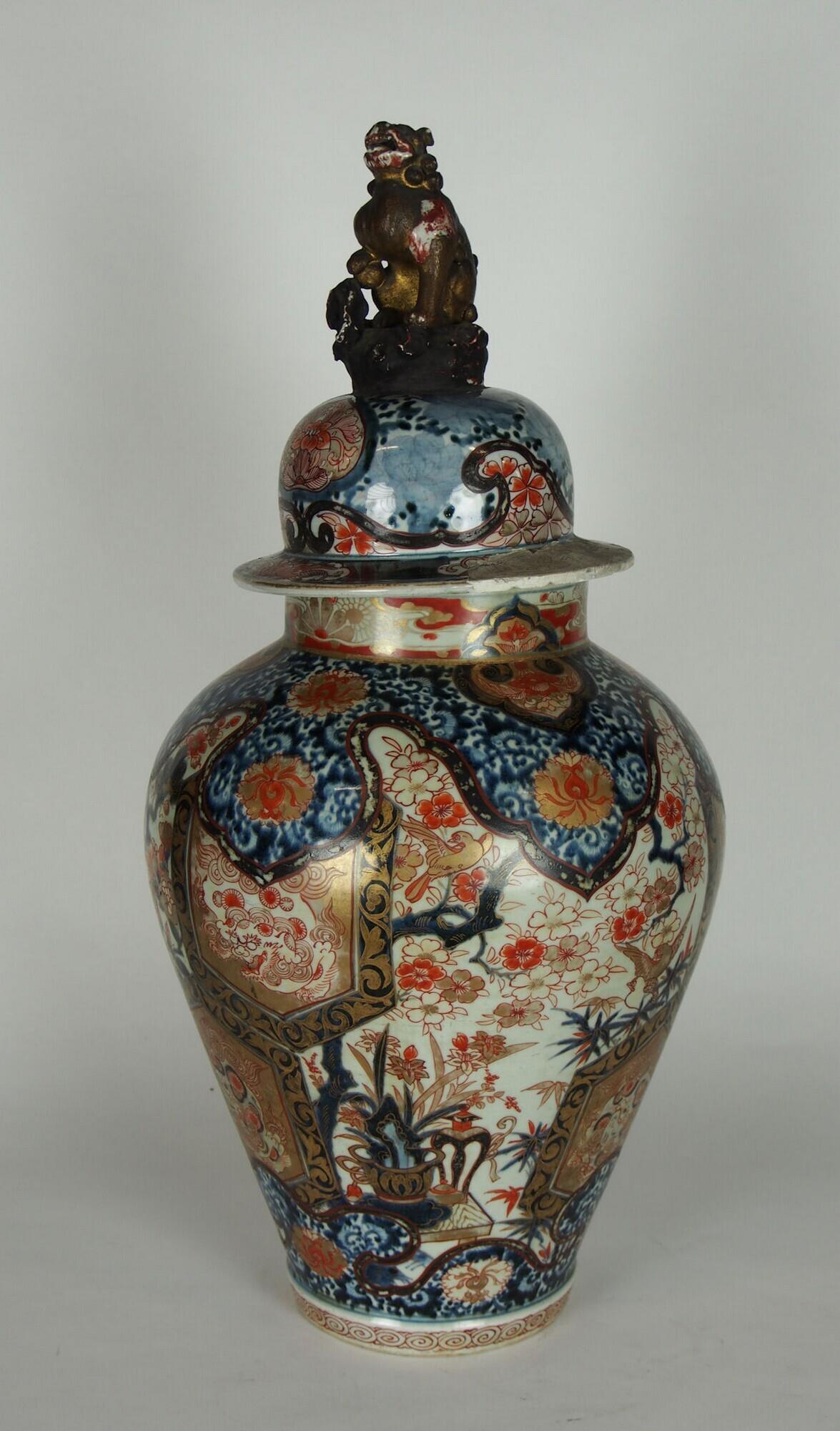 De vaas is balustervormig en heeft een standring, een rechte hals en een klokvormig deksel met een knop in de vorm van een karashishi met een bal onder de voorpoot. Op de standring loopt een band met spiraalvormige versiering. Boven de standring en op de schouder lopen grillig gevormde banden met rankwerk met daarin bloemen en lotusvormige cartouches met bloemen. Op de buik bevinden zich gepunte vakken met een rand met gestileerd rankwerk waarin floraalmotieven, en grillige cartouches met decors van bamboe, bloeiende prunus, vogels, en tafeltjes met vazen en potplanten. Op de hals loopt een band met een decor van bloemen en lotusvormige cartouches met bloemen. Het deksel is gedecoreerd met lotusbloemen en rankwerk met daarin bloembladvormige en grillige cartouches met bloemen. Op de rand loopt een band waarin geschulpte cartouches met floraalmotieven. (Nederlands)