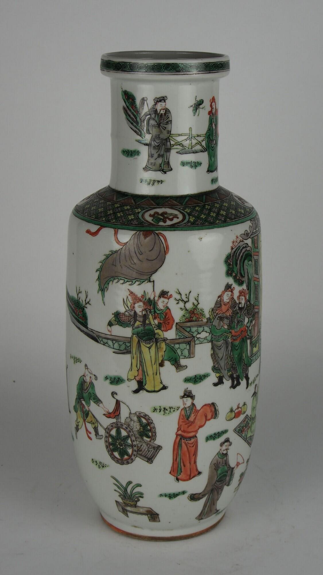 De vaas, in Kang Xi-stijl, is convex-cilindrisch van vorm en heeft een standring, een conische schouder en een licht concaaf-conische hals met een opstaande monding. De buik heeft een decor van een landschap met rotsen en een centraal huis met een bordes waarop een hoogwaardigheidsbekleder zit, omgeven door een tuin met een hek, rotsen, een pijnboom, twee krijgers en een groot aantal oosterse figuren met uiteenlopende attributen. De schouder heeft een band met bloemvormig servetwerk, waarin vier ovale cartouches met boeddhistische symbolen, en een band met alternerend gearceerd driehoekig servetwerk. De hals heeft een decor van een tuin met een hek, rotsen, een pijnboom, een vlinder, een krijger en drie staande figuren. Op de opstaande rand loopt een band met servetwerk. (Nederlands)