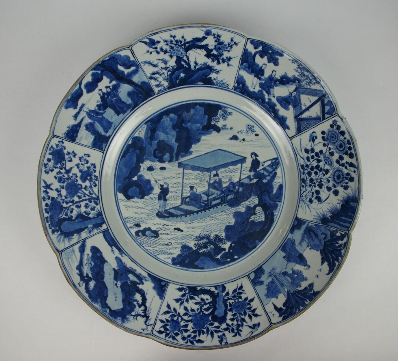 De schaal heeft een standring en een brede, schuin oplopende, licht gecontourneerde gegolfde rand. Het plat heeft binnen een dubbele cirkel een decor van een rivierlandschap met rotsen, planten en een boot met baldakijn, waarop twee staande en twee zittende oosterse figuren. De rand heeft acht panelen waarin afwisselend bloeiende planten, rotsen en vogels, en verschillende landschapsdecors met oosterse figuren. De rand heeft aan de buitenzijde acht panelen met bloeiende planten, rotsen en vogels. Enige randschade. (Nederlands)